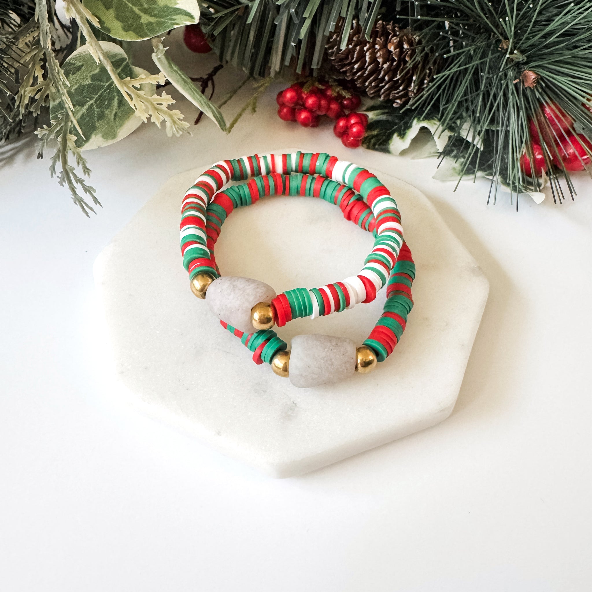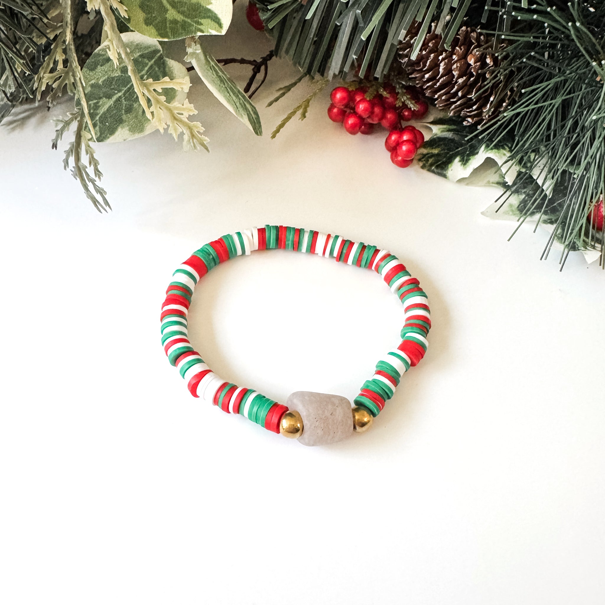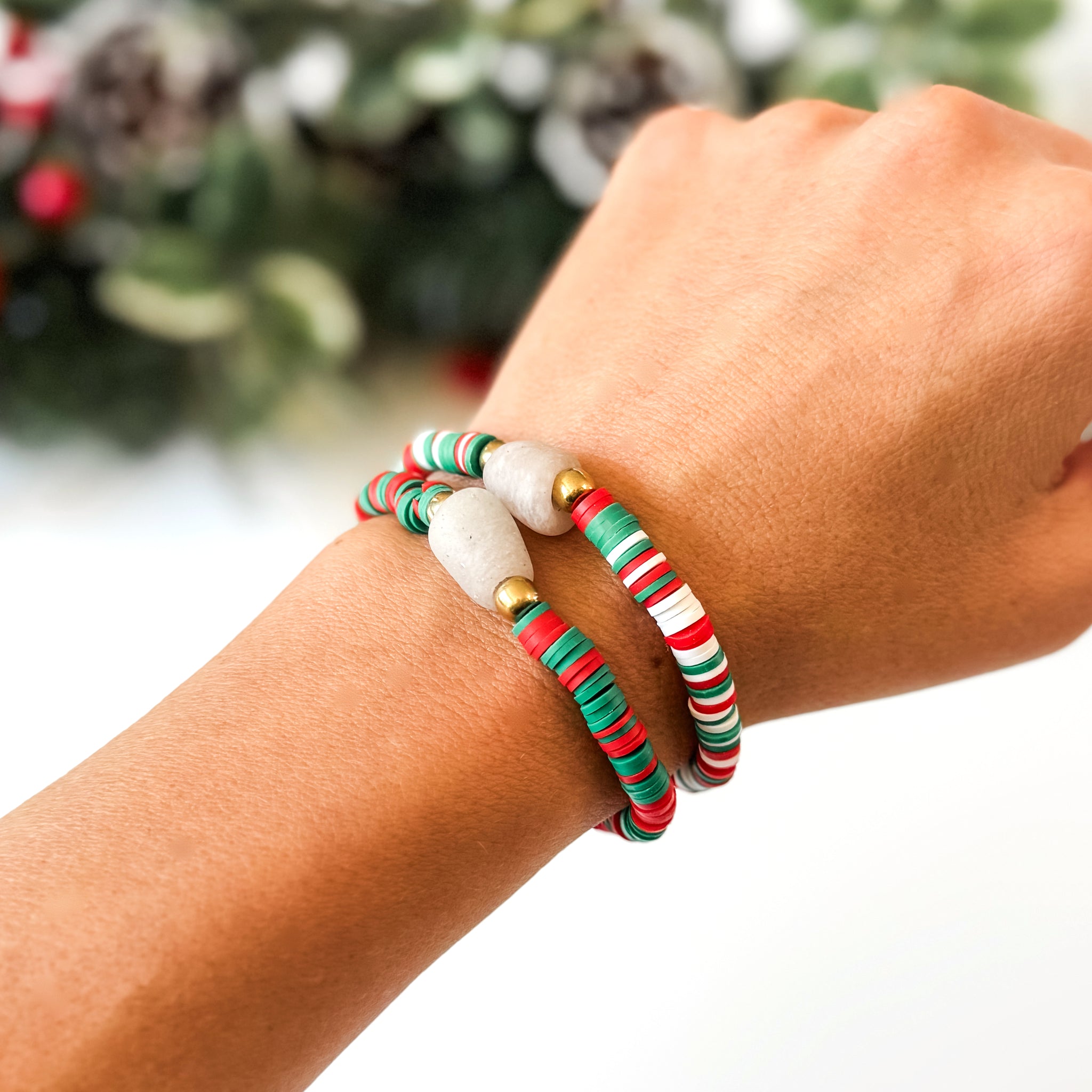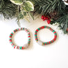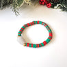 The Christmas Vibe Bracelet makes an easy addition to any holiday outfit and the perfect accessory for seasonal style. Each stretchy bracelet is hand-made and features polymer clay beads, seed beads, and a cylinder shaped recycled glass bead.