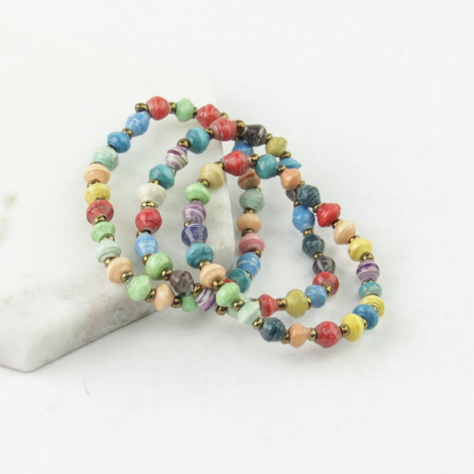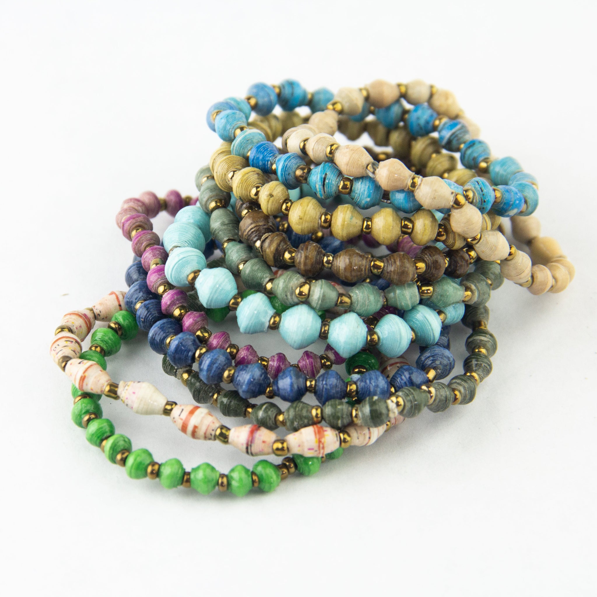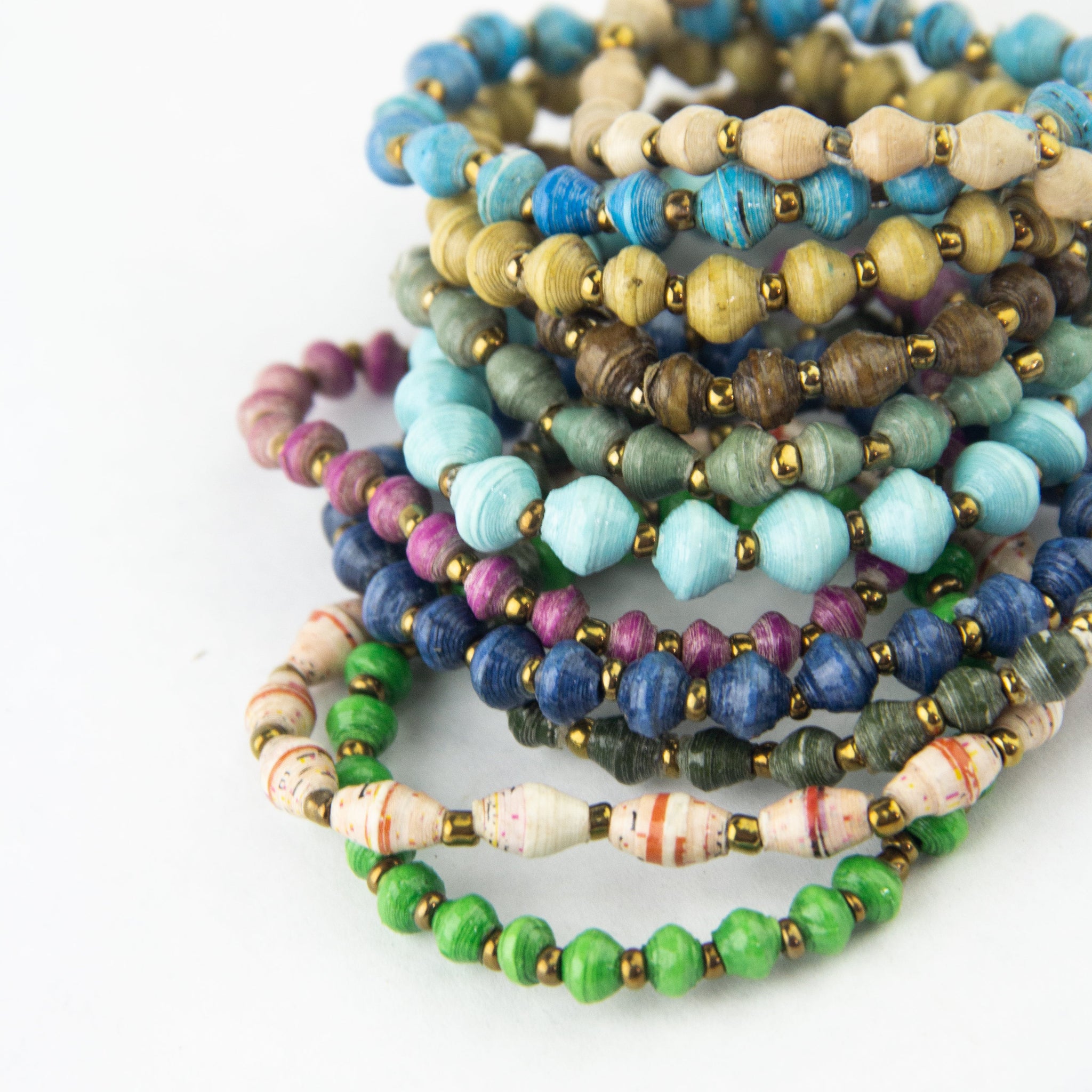 PLEASE NOTE: The pictures below show a sampling of the colors used to create these bracelets. Because the magazine paper available to the artisans varies, we cannot send you an exact color, but you can choose which color family you'd like your bracelet from.