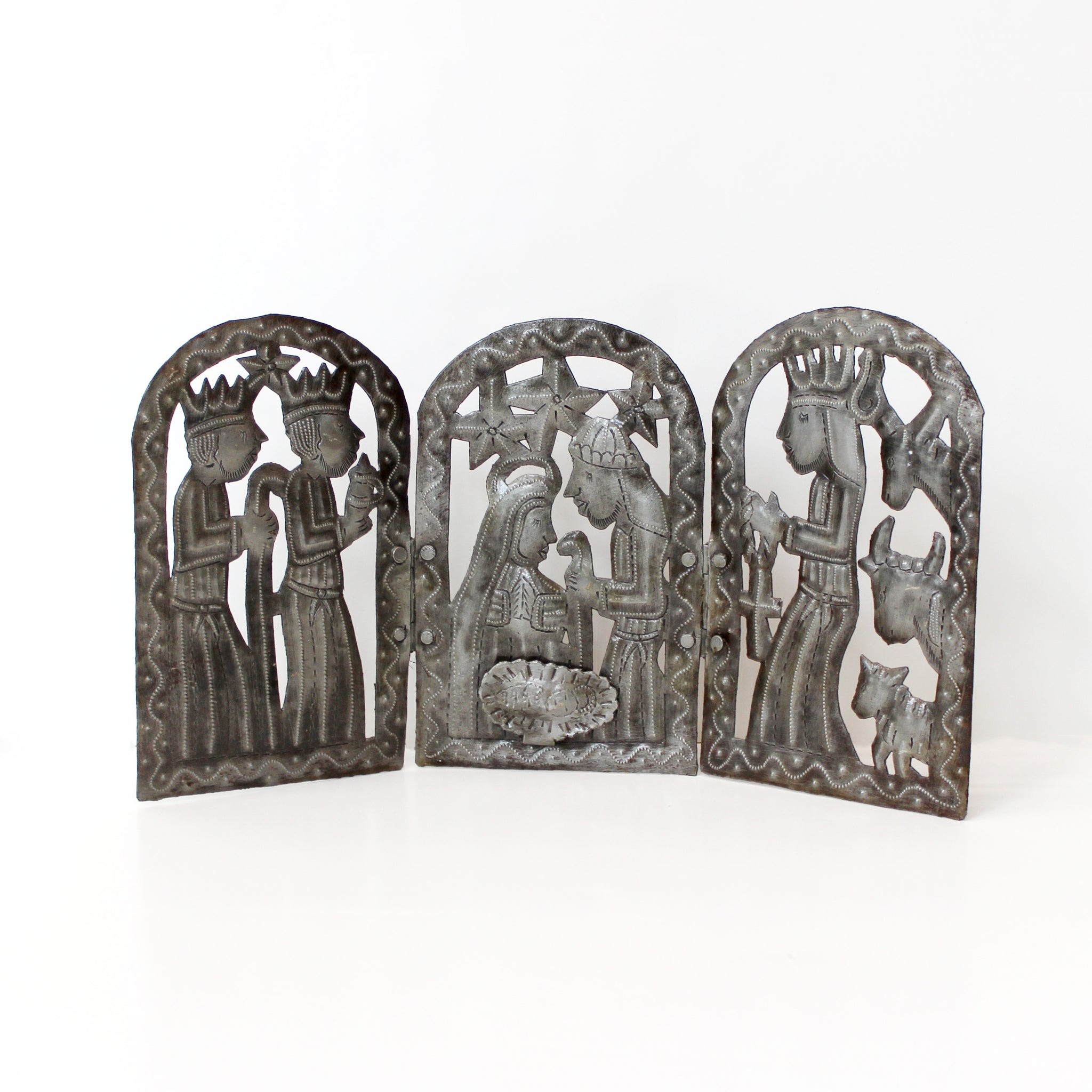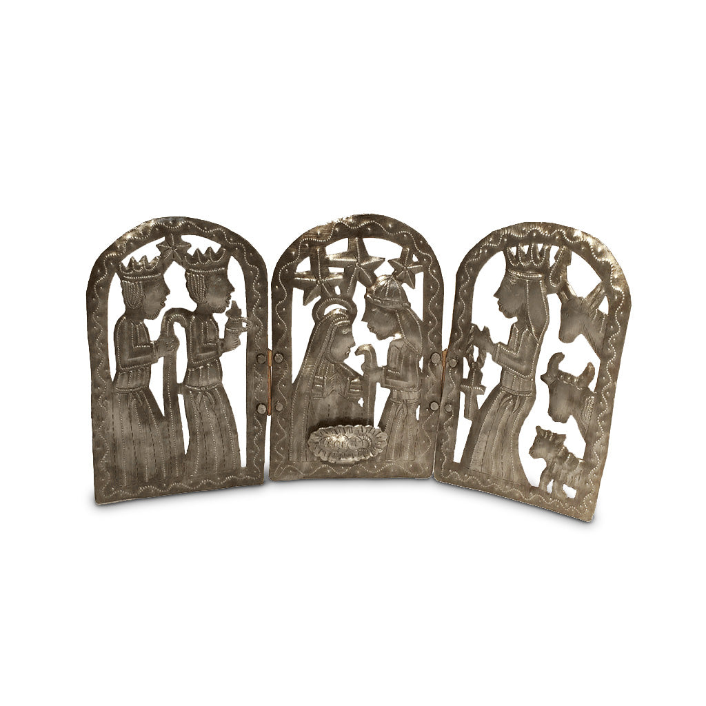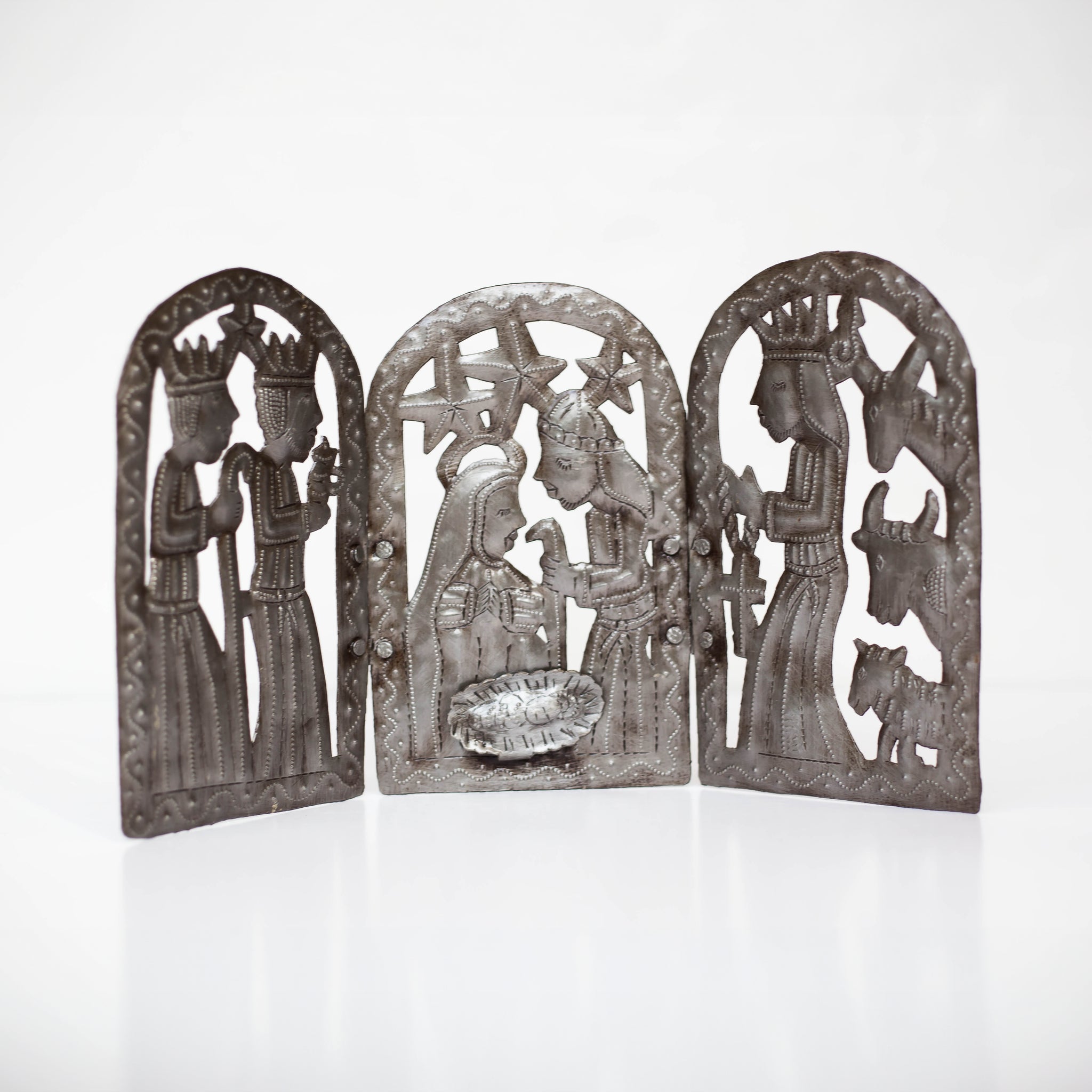 Celebrate the true meaning of the season with this stunning Trifold Nativity Scene, lovingly handmade in Haiti by skilled artisans. Crafted from recycled 55-gallon oil drums and finished with thoughtful detailing, this tabletop piece unfolds to reveal the timeless nativity scene — a beautiful reminder of hope, peace, and new beginnings.