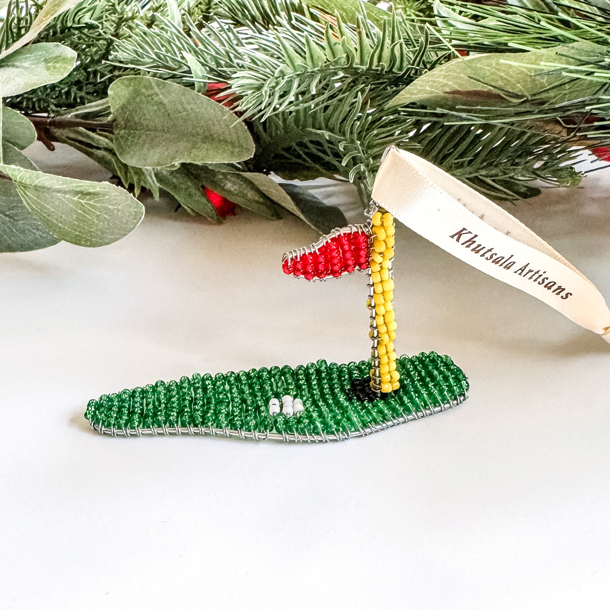 Celebrate the love of the game with this charming handcrafted golf ornament, made bead-by-bead by the Khutsala artisans in Eswatini, Africa. Each ornament is shaped and detailed entirely by hand, featuring intricate beadwork that adds sparkle and texture. Whether you’re a golfer yourself or gifting to someone who can’t resist a day on the green, this ornament brings a touch of personality and craftsmanship to any tree.