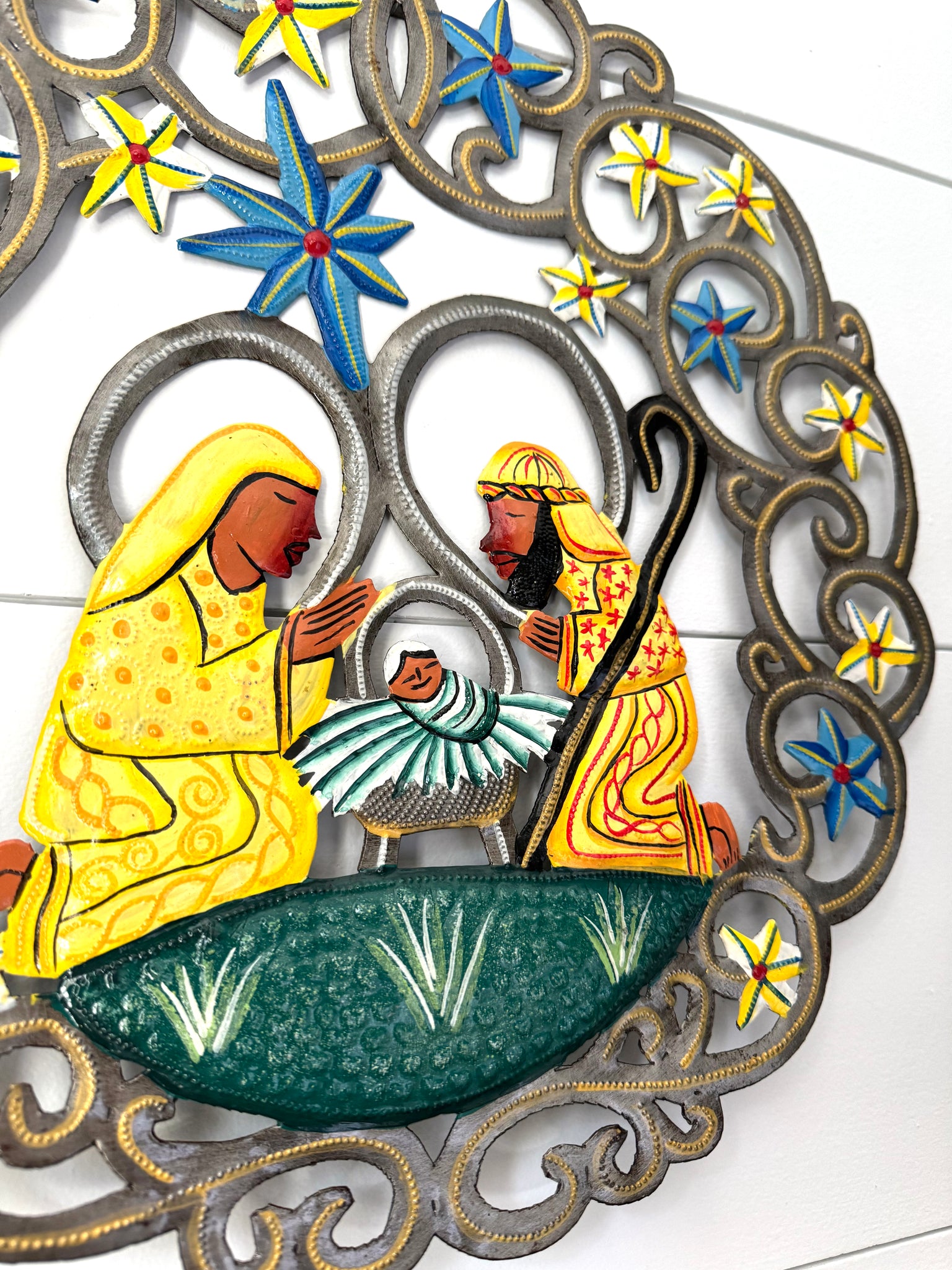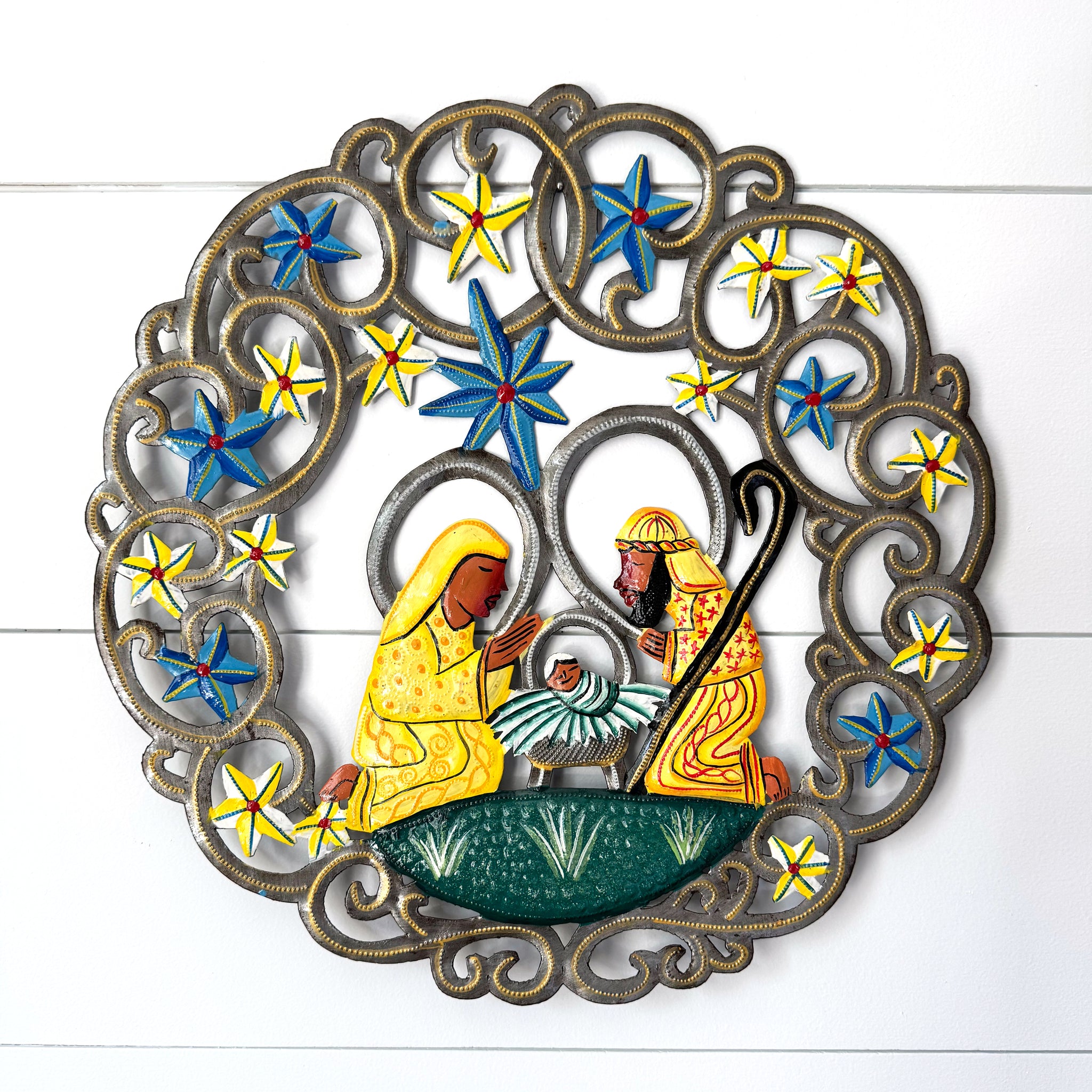 This beautiful Holy Family Starry Nativity is handcrafted from recycled 55-gallon oil drums and hand-painted with attention to detail, for a unique and meaningful holiday decoration. Bring the spirit of Christmas into your home and enjoy the peace and joy of the season.
