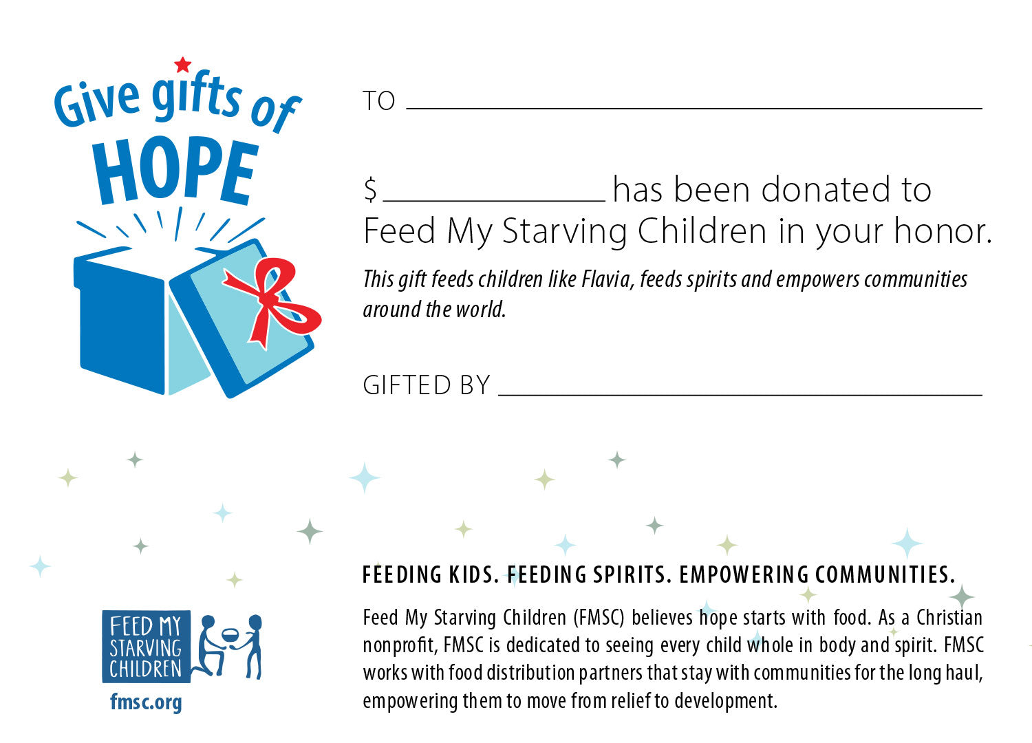 - Donate that amount to FMSC (your purchase goes straight to FMSC and feeds starving kids worldwide!).