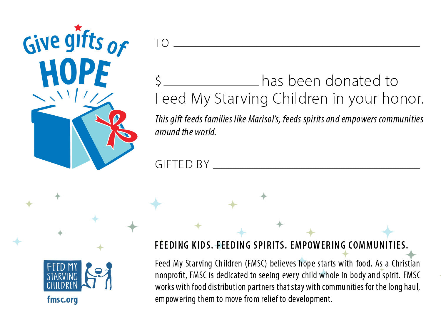 - Donate that amount to FMSC (your purchase goes straight to FMSC and feeds starving kids worldwide!).