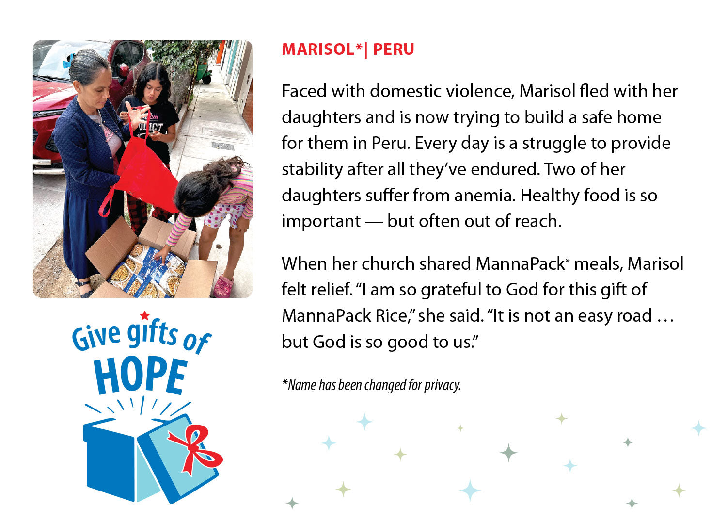 When her church shared MannaPack® meals, Marisol felt relief. “I am so grateful to God for this gift of MannaPack Rice,” she said. “It is not an easy road …but God is so good to us.”