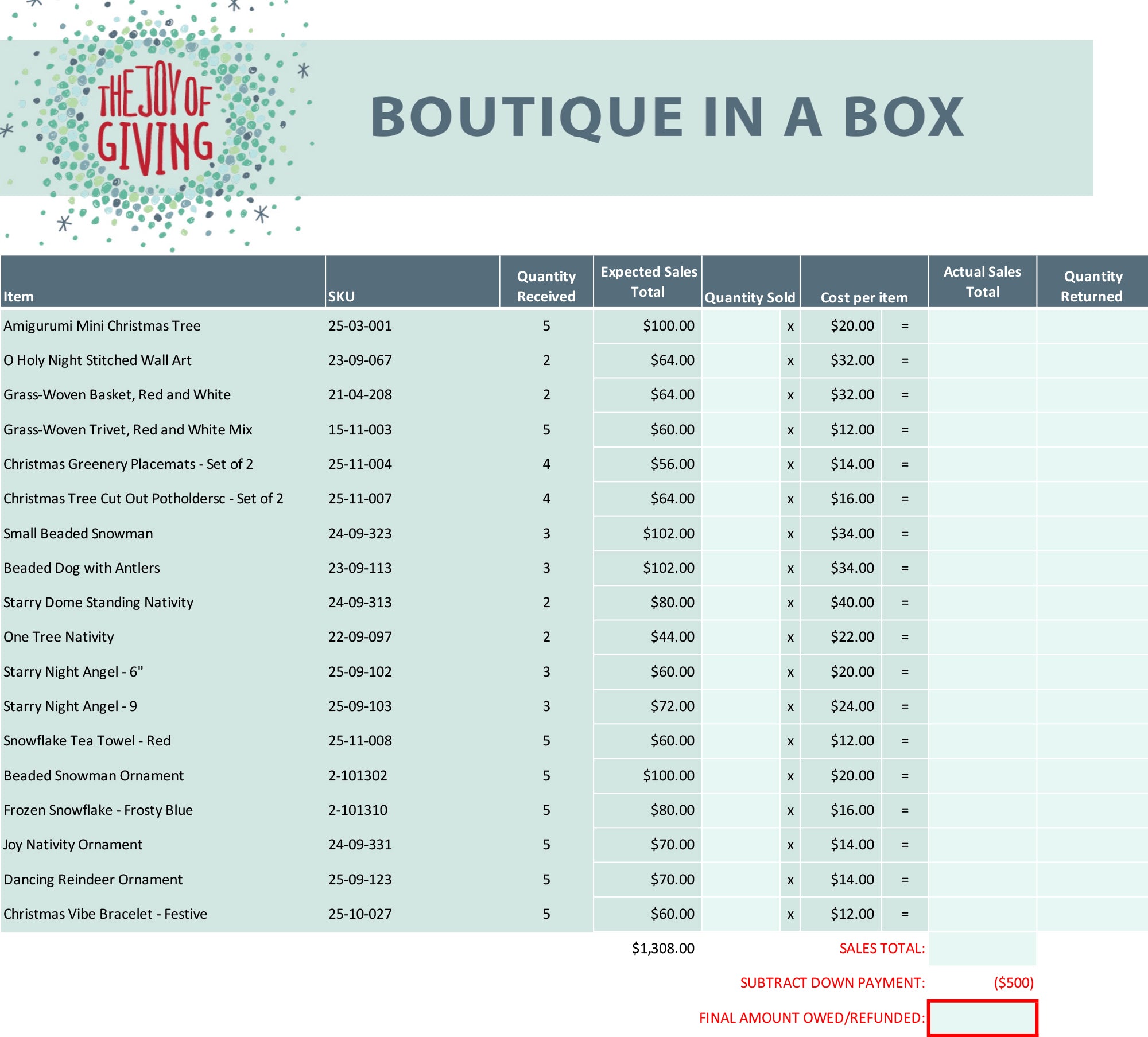 - Return any unsold items to FMSC MarketPlace by January 10, 2026. We will provide a prepaid return shipping label!