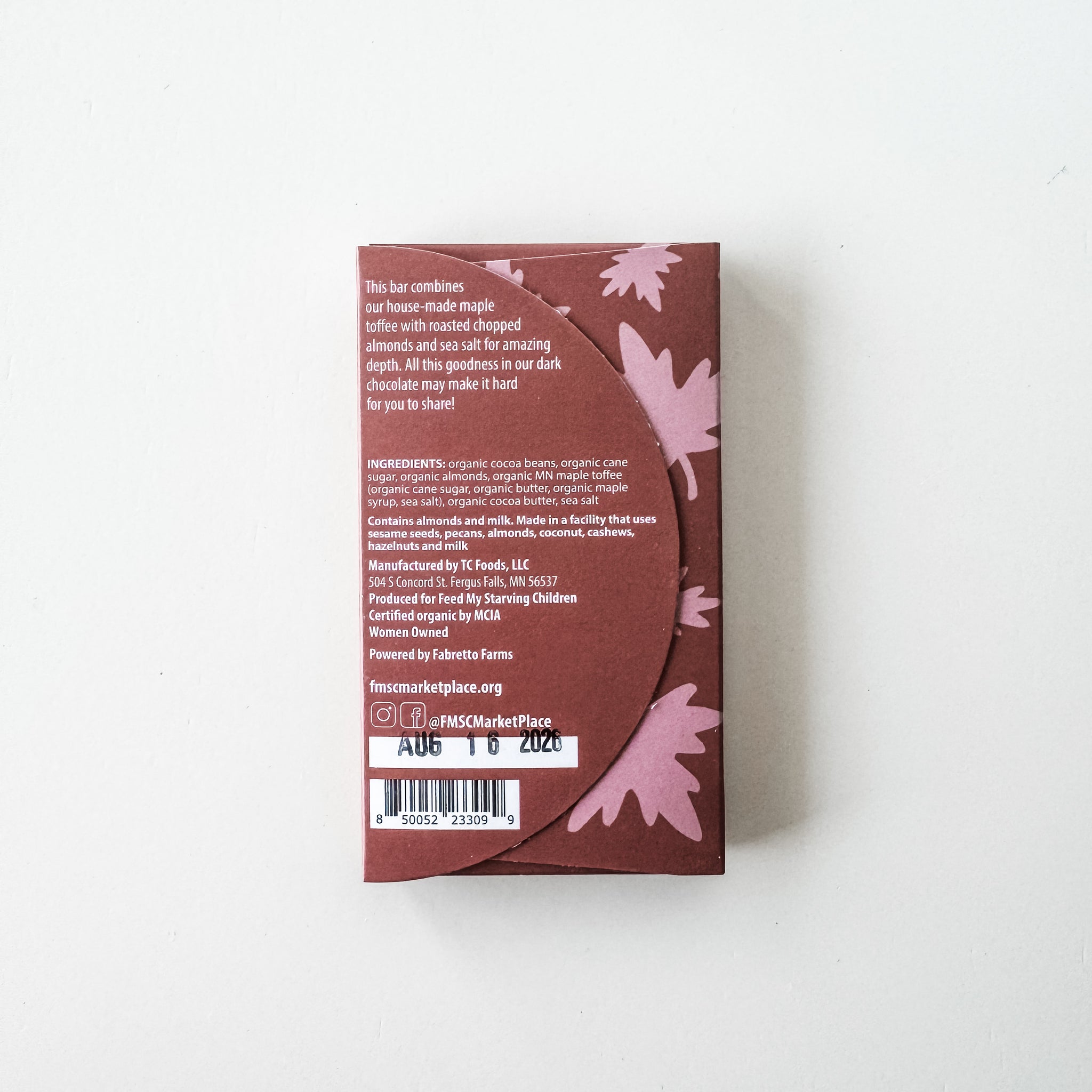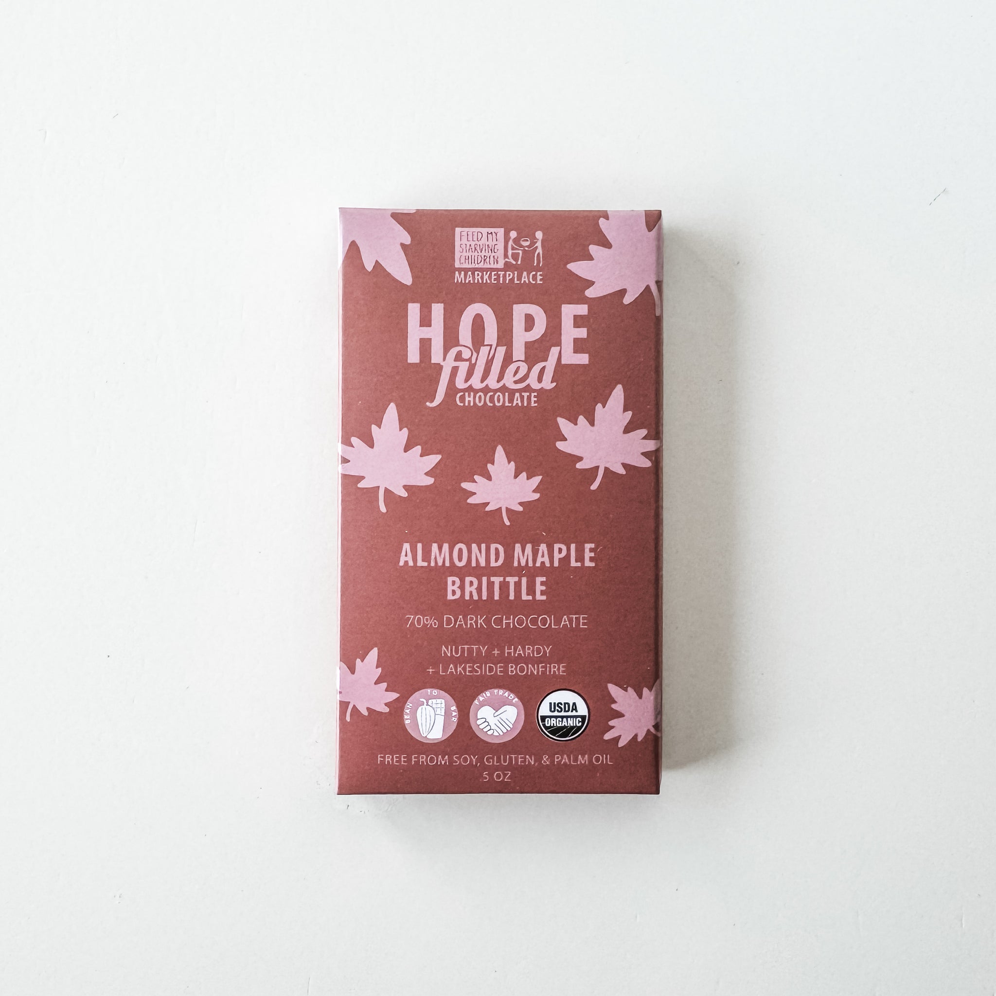 This bar combines our house-made maple toffee with roasted chopped almonds and smoked sea salt for amazing depth. All this goodness in our dark chocolate may make it hard for you to share! Ingredients: Organic cocoa beans, organic cane sugar, organic cocoa butter, organic smoked maple brittle (organic cane sugar, organic butter, organic maple syrup, smoked sea salt), organic almonds