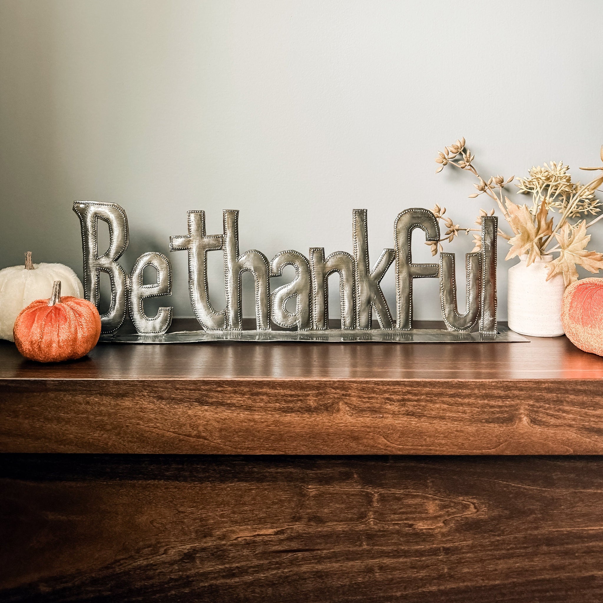 The Be Thankful Standing Metal Art will look beautiful on your mantle, shelf, or window sill. We love having this constant reminder front and center in our homes.