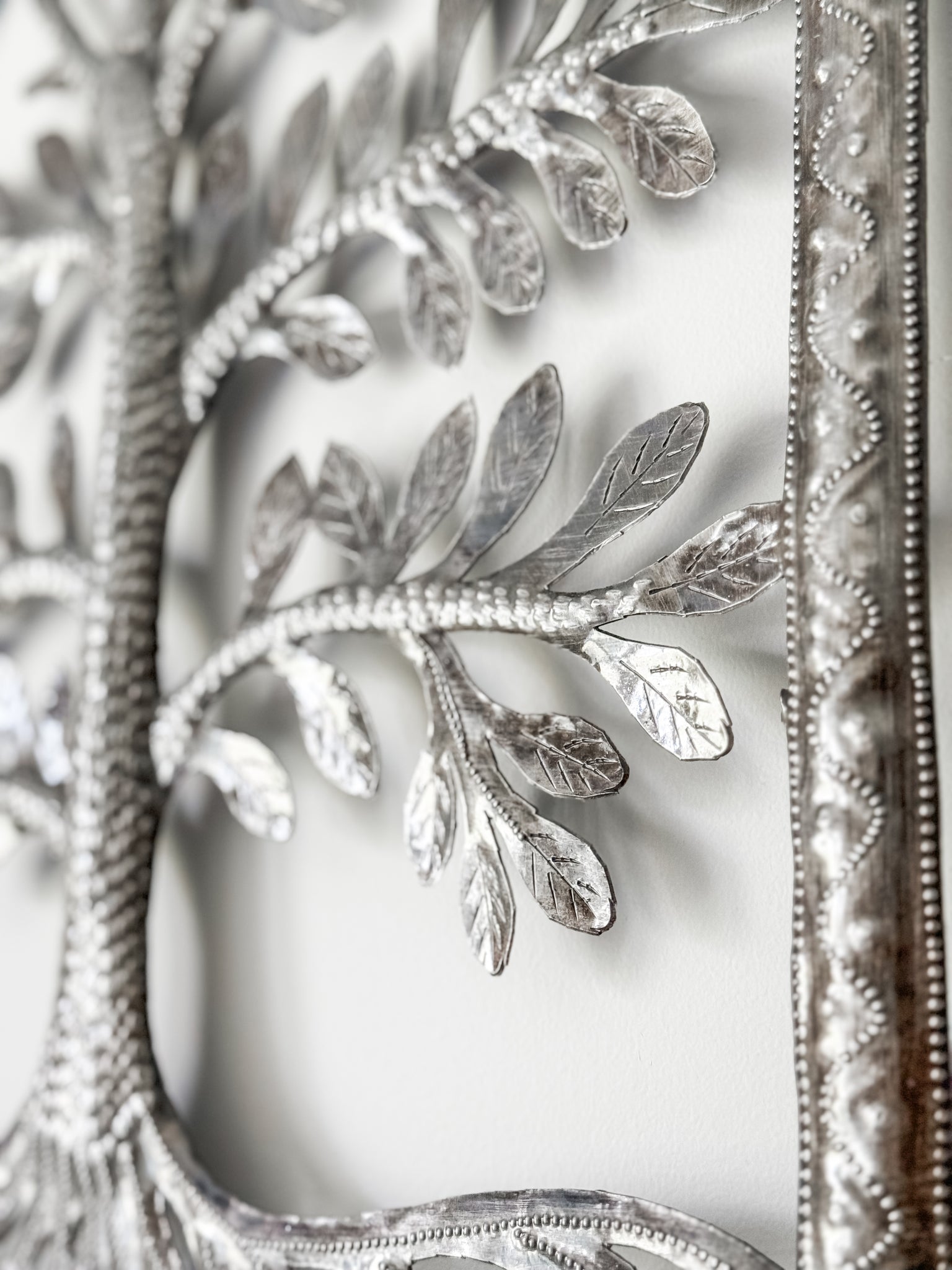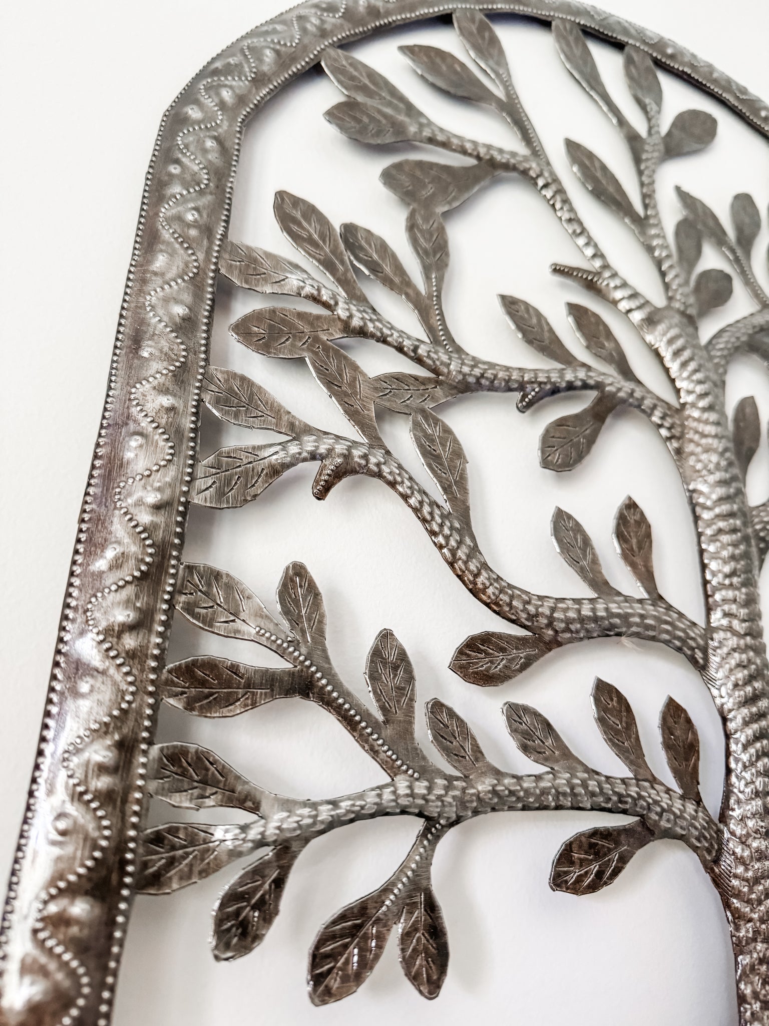 The Haitian Tree of Life Metal Art is a substantial art piece for your wall with plenty of "wow" factor. Made from recycled 55-gallon oil drums in a small Haitian village, the talented metal artisans cut, hammer, and chisel the metal into gorgeous pieces with amazing detail. Your purchase helps these artisans stay busy, provide more jobs, and support their families.