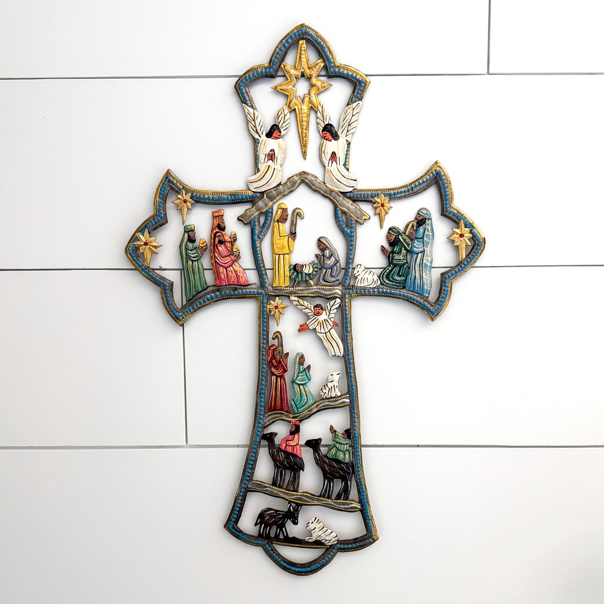 Bring faith and artistry to your holiday décor with this Nativity Oil Drum Cross, handcrafted from recycled oil drums in Haiti. Each cross features a beautifully detailed depiction of the Holy Family, made with care by skilled artisans who transform reclaimed metal into a meaningful work of art. A unique and thoughtful piece, it honors tradition while supporting sustainable craftsmanship.