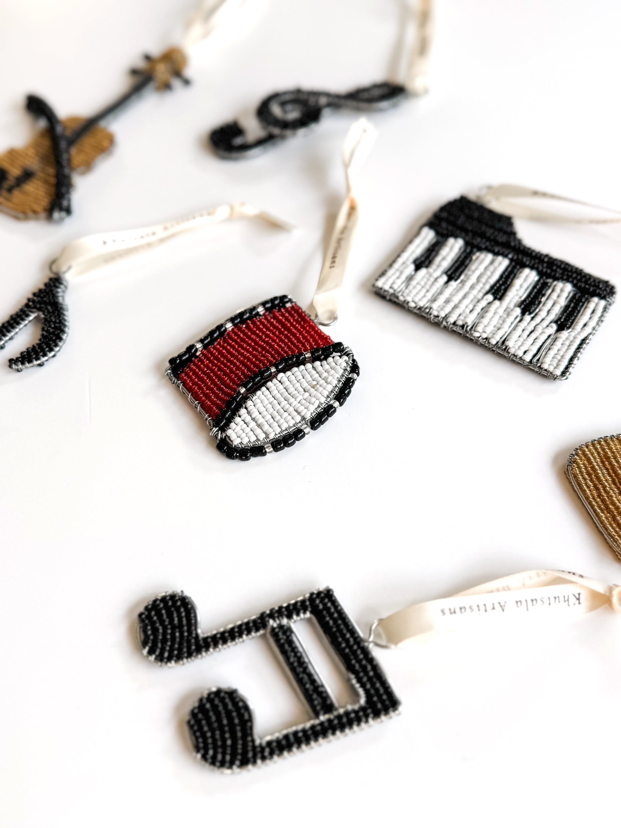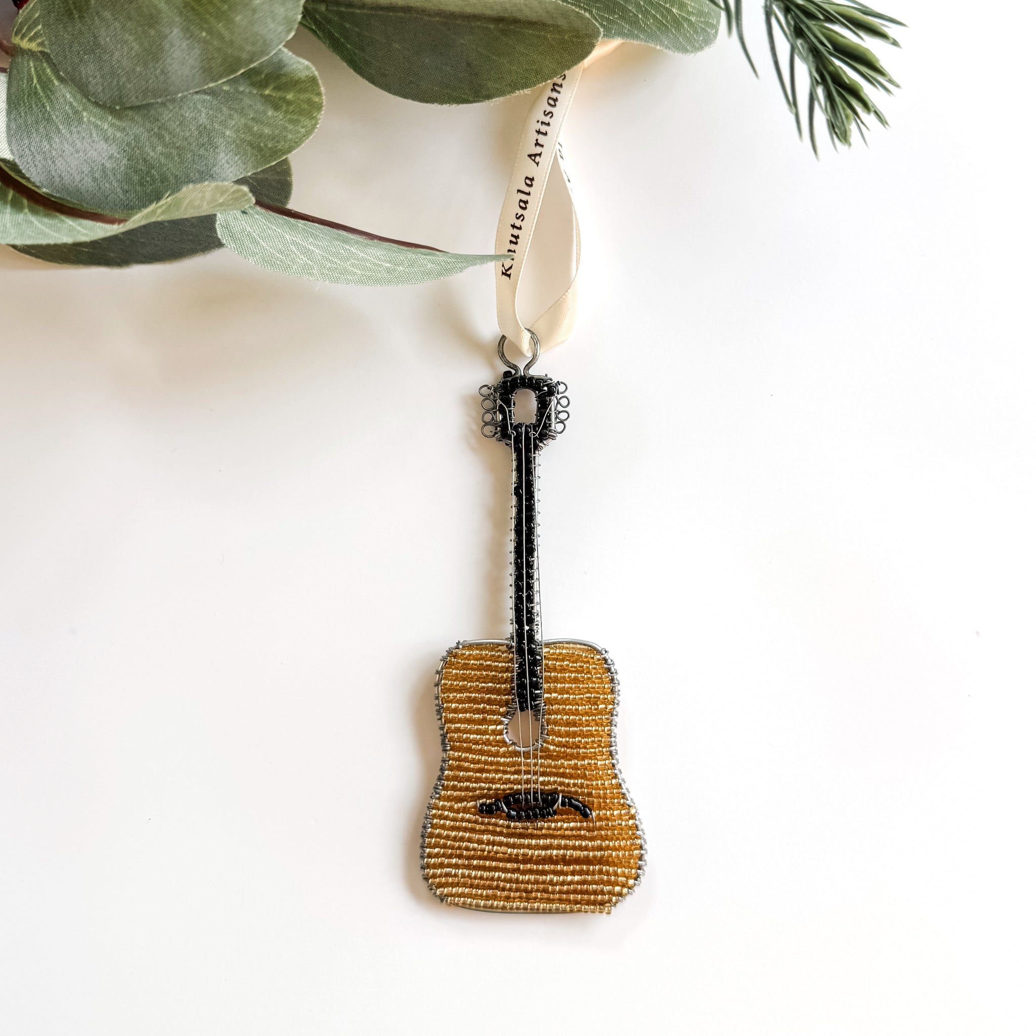 Strike a festive chord with this handcrafted beaded guitar ornament from Eswatini. Made bead by bead by skilled Khutsala artisans, each ornament showcases intricate detail that brings the instrument to life. Perfect for music lovers and holiday décor alike, this unique piece adds a touch of rhythm, sparkle, and artisan craftsmanship to any tree.