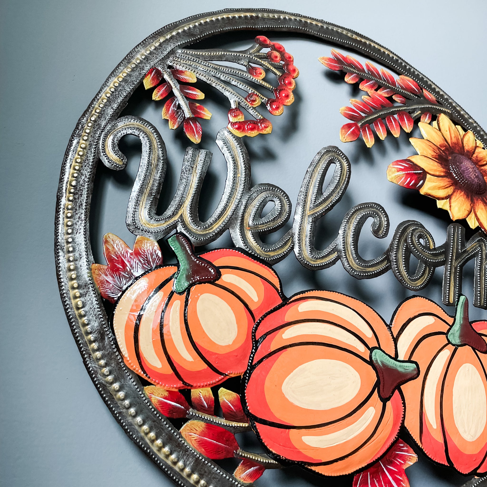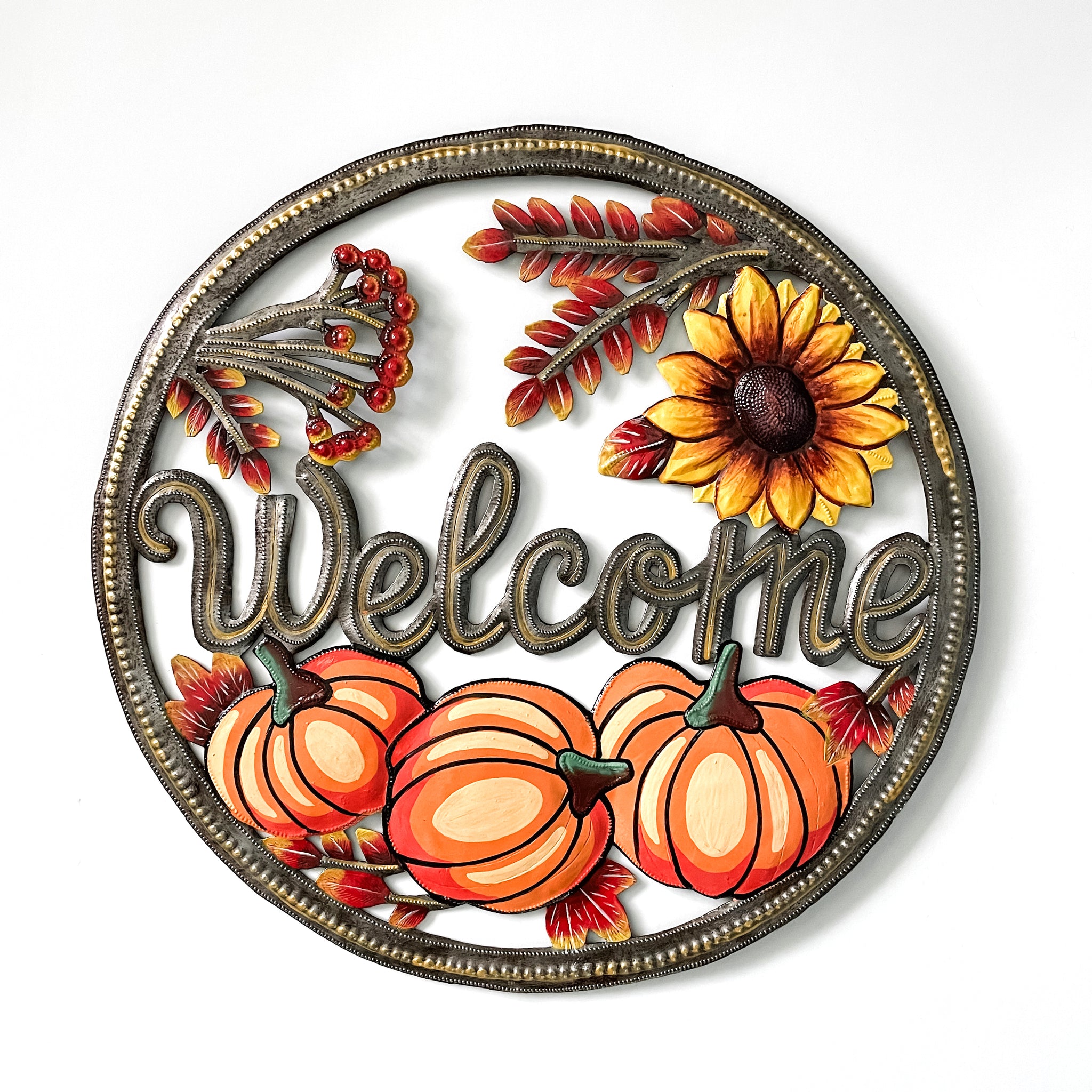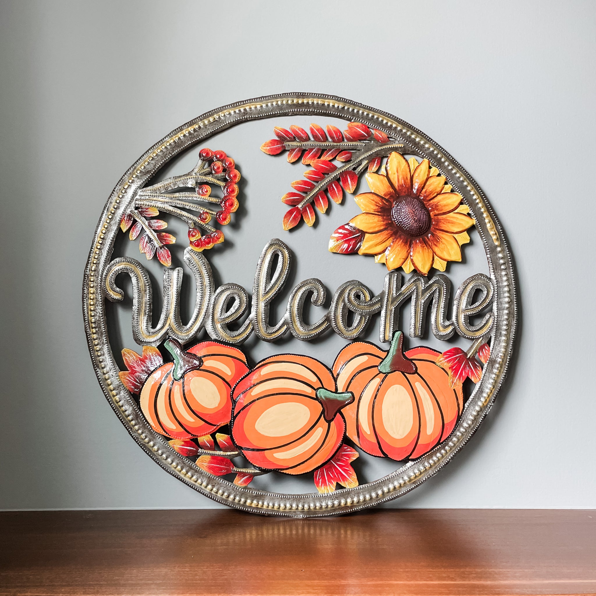 This stunning Metal Welcome Wreath embodies exclusive craftsmanship, with each piece handcrafted by skilled artisans in Haiti. Its unique design and vibrant colors will add an elegant, tasteful touch to your fall decor. Welcome guests to your home in style.
