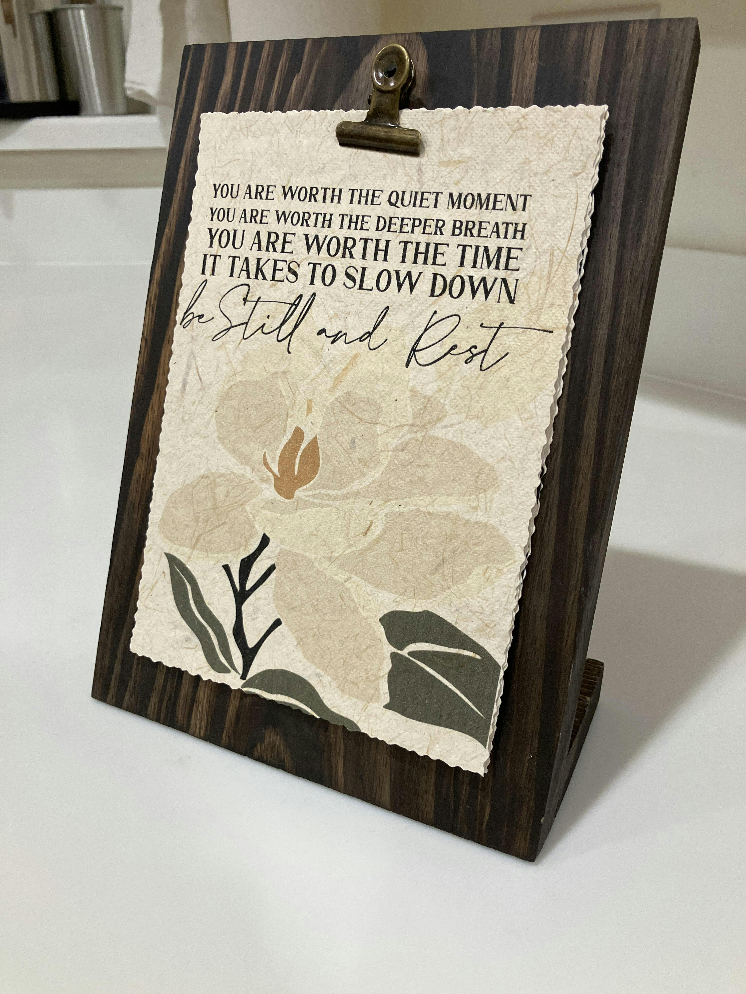 Take some time to appreciate the beauty of life with the Beautiful Things Clipboard Set. Let the words "beautiful things grow here" and "you are worth" serve as a reminder to slow down, breathe deeply, and rest. Give yourself the gift of stillness with this supportive and approachable set, which includes (3) 5.5" x 7.75" signs and a handcrafted clipboard display stand.