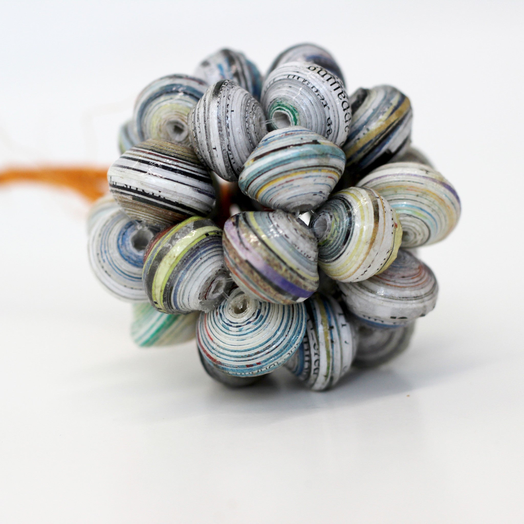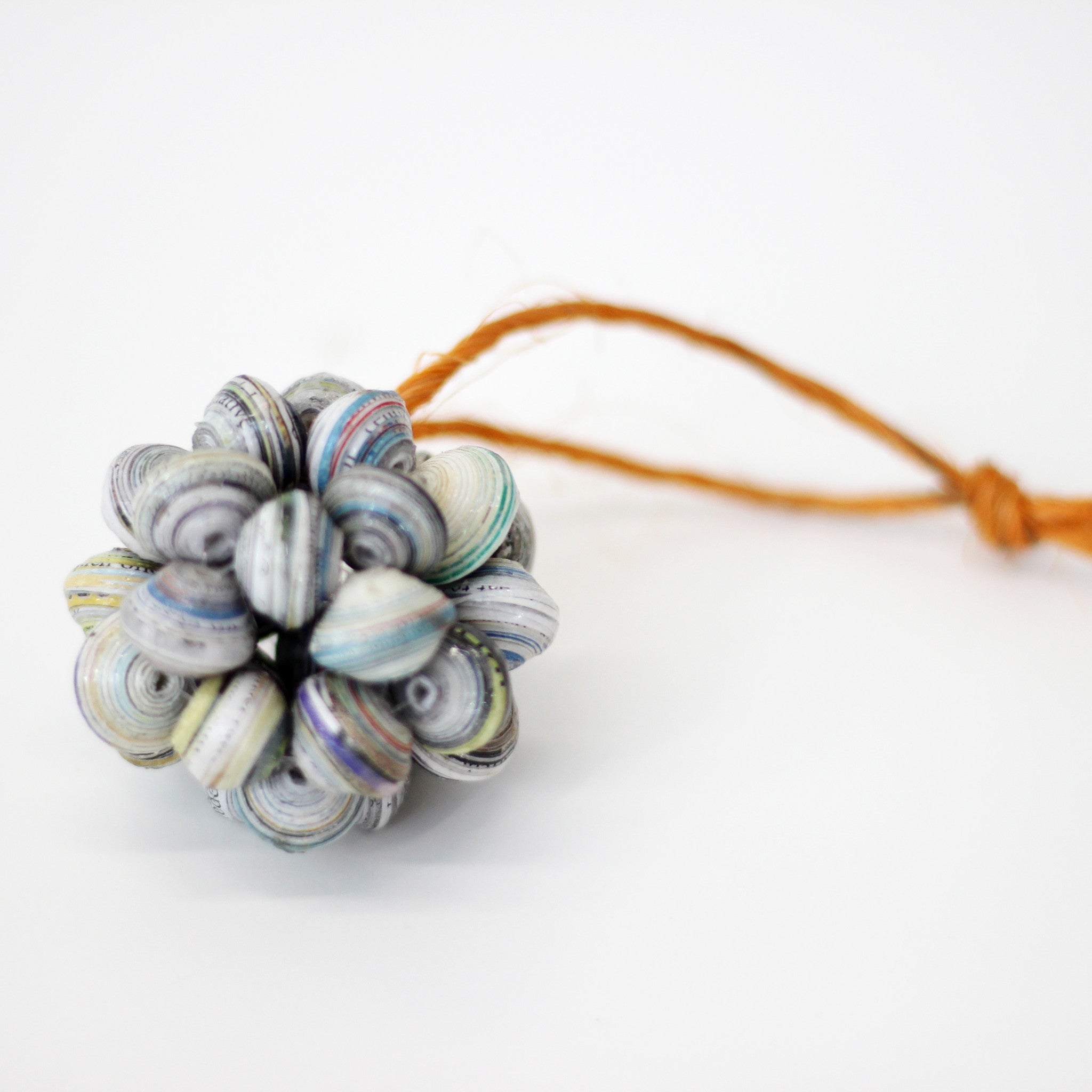 This ornament was created by the Hope Again Women's Project in Rakai, Uganda. The women cut recycled magazines into strips, roll them into beads, and then shellac them. The beads are then strung together to create this unique ornament.