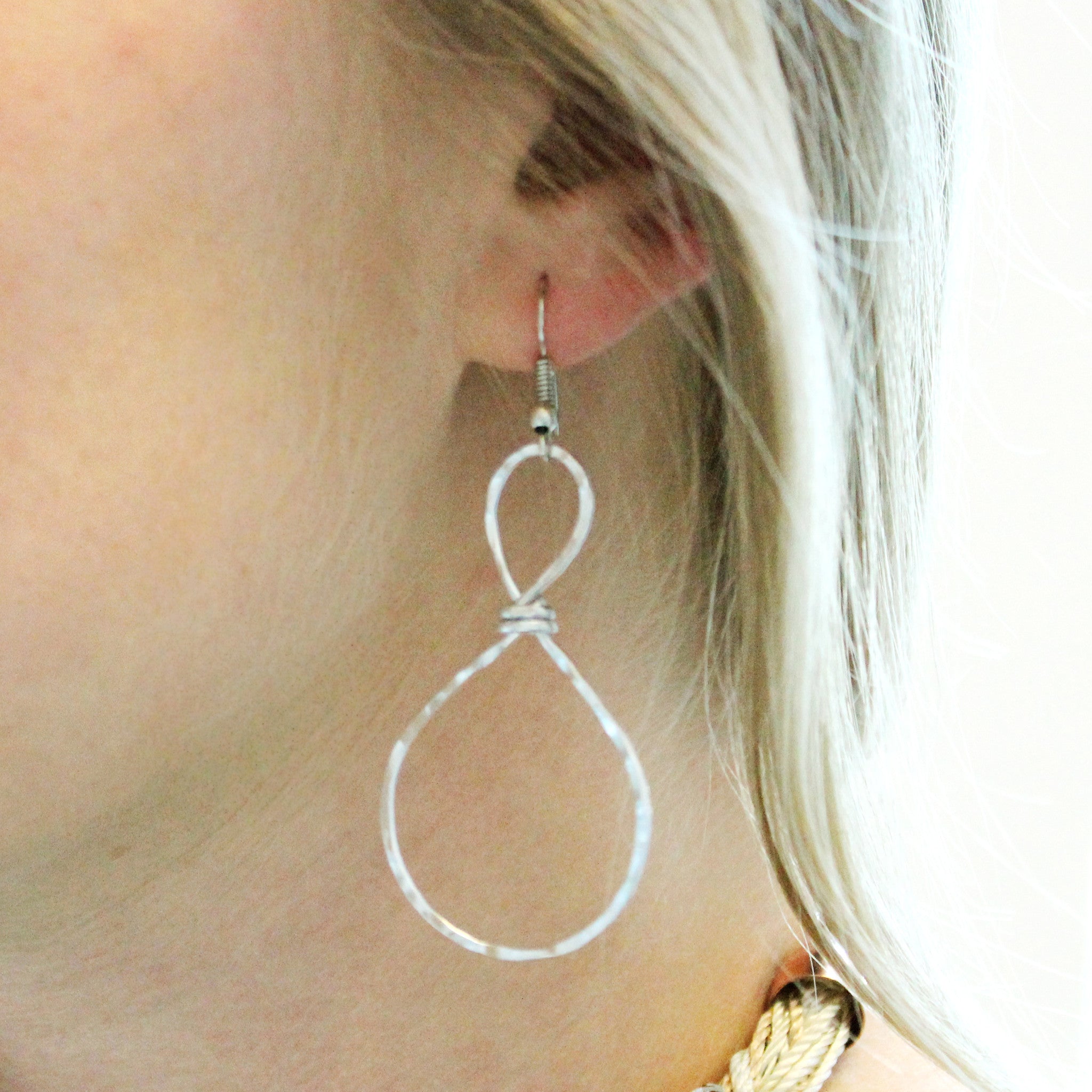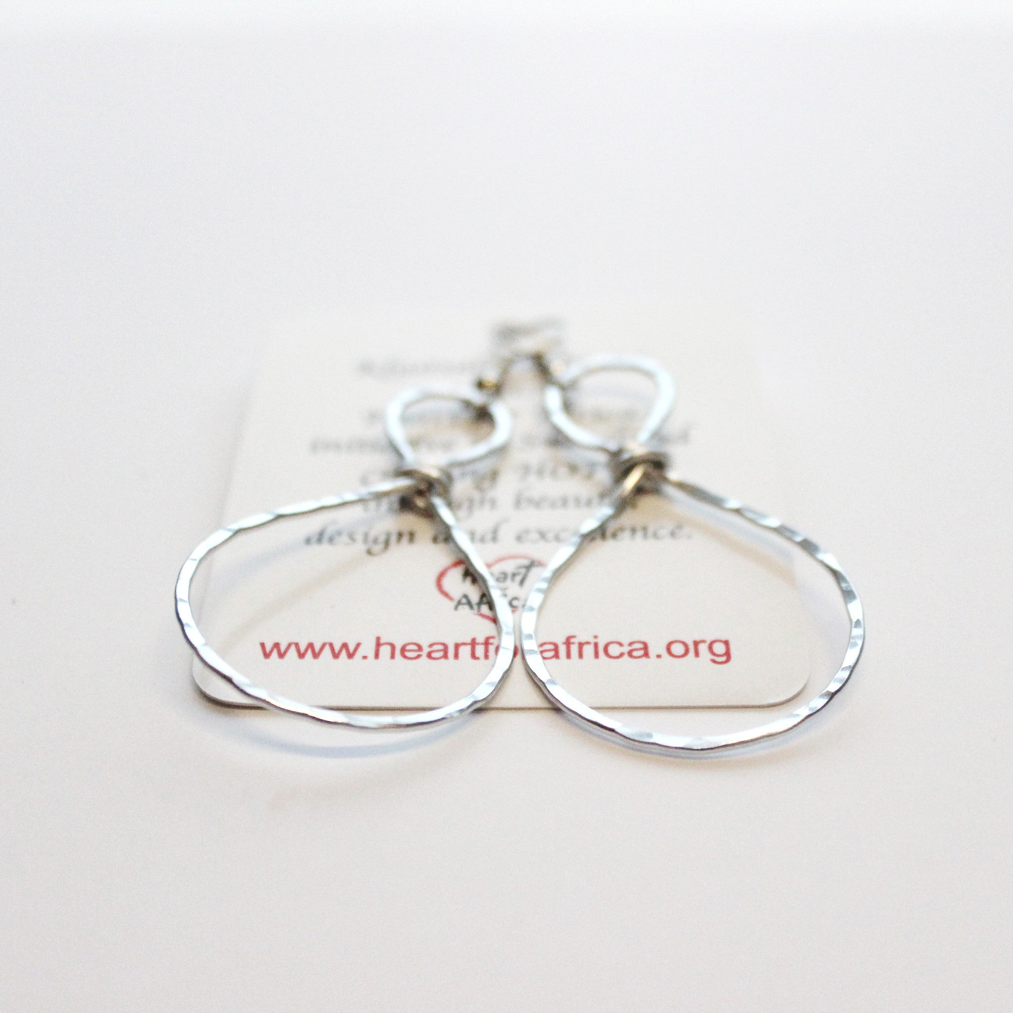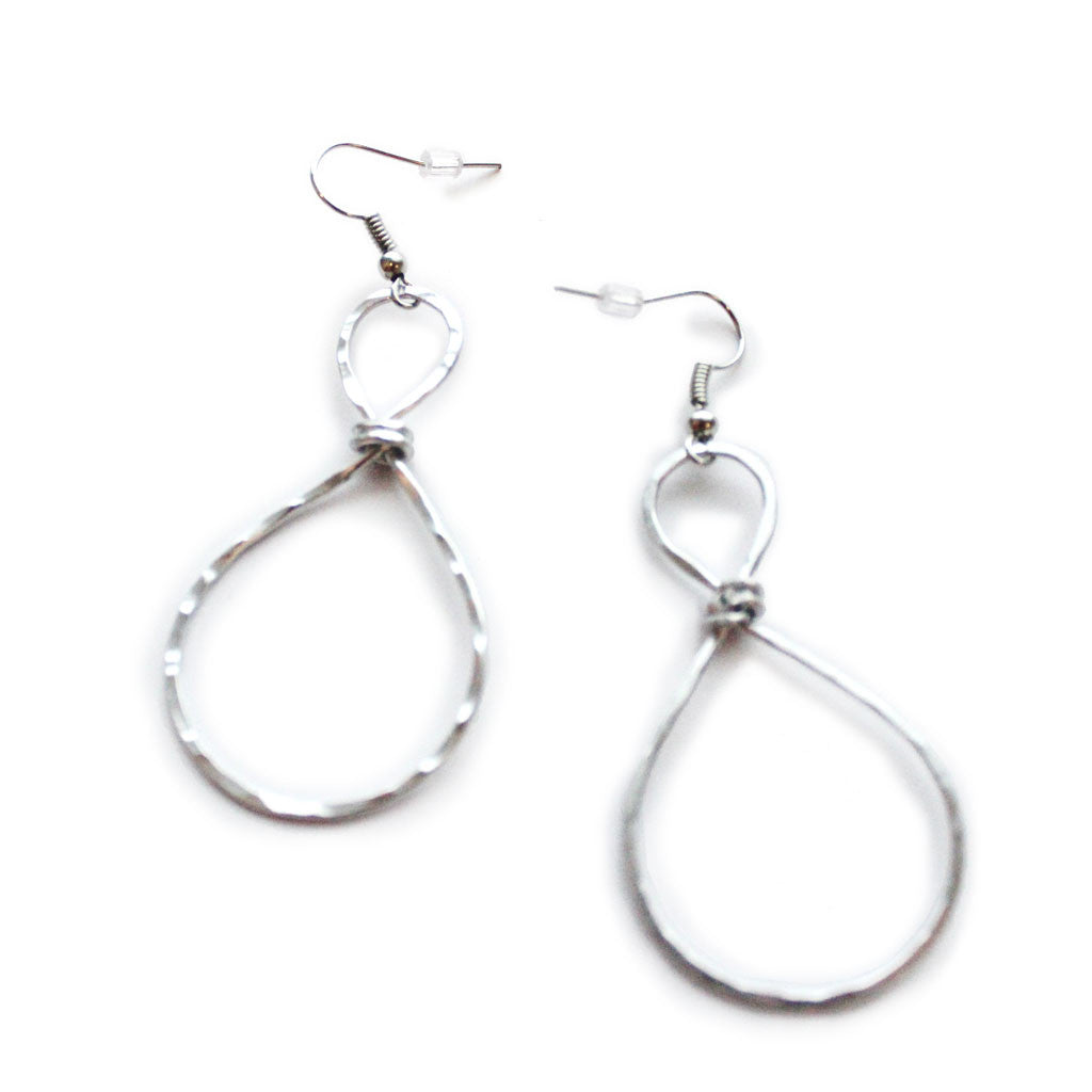 These handmade, hammered infinity earrings give a new twist to the "hoop" style. They are designed and handcrafted by the Khutsala artisans in Eswatini, Africa.