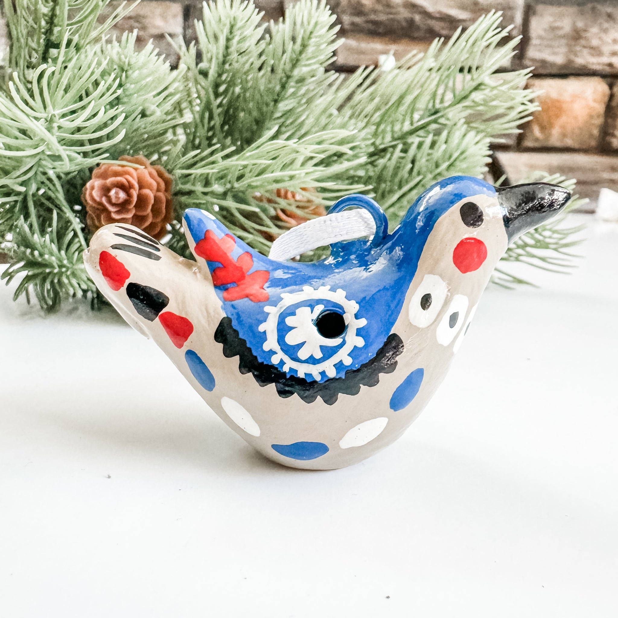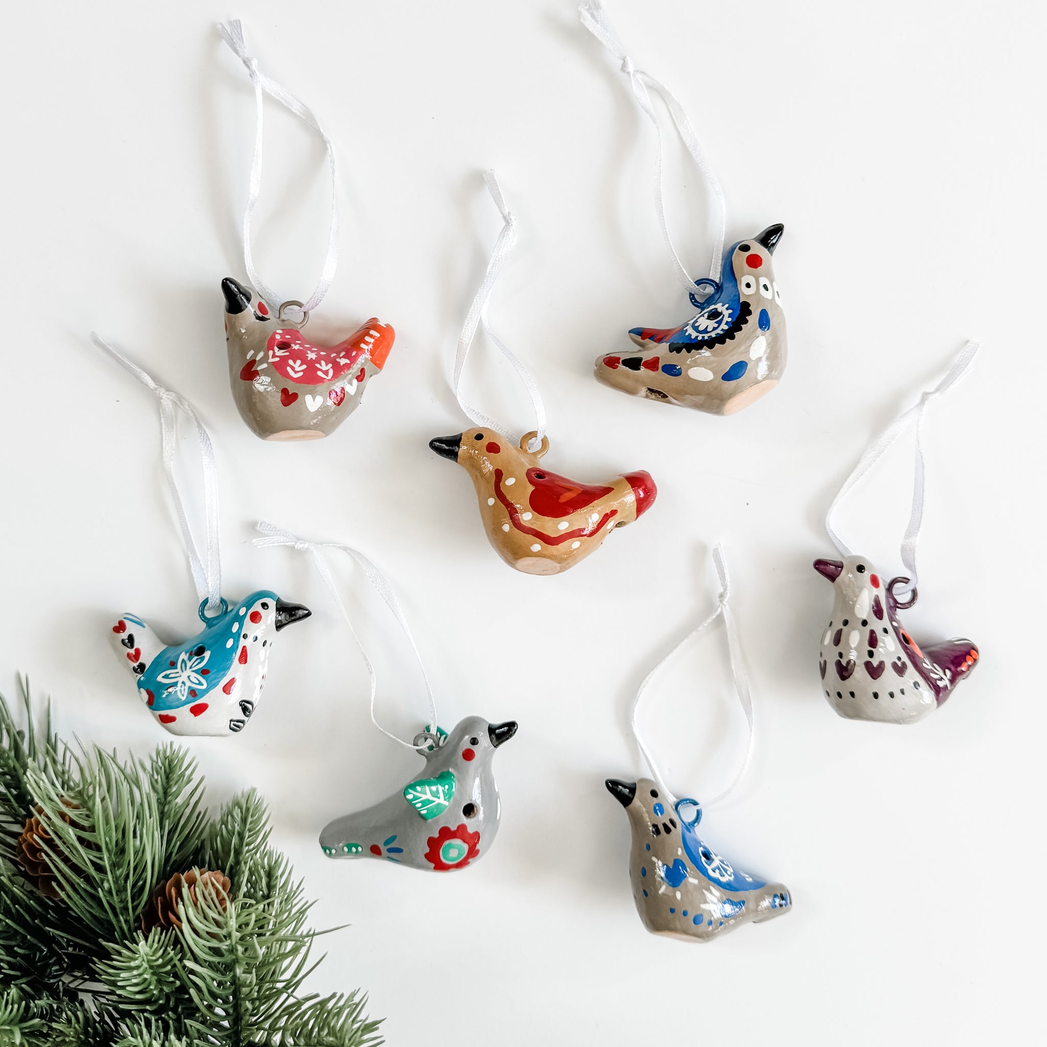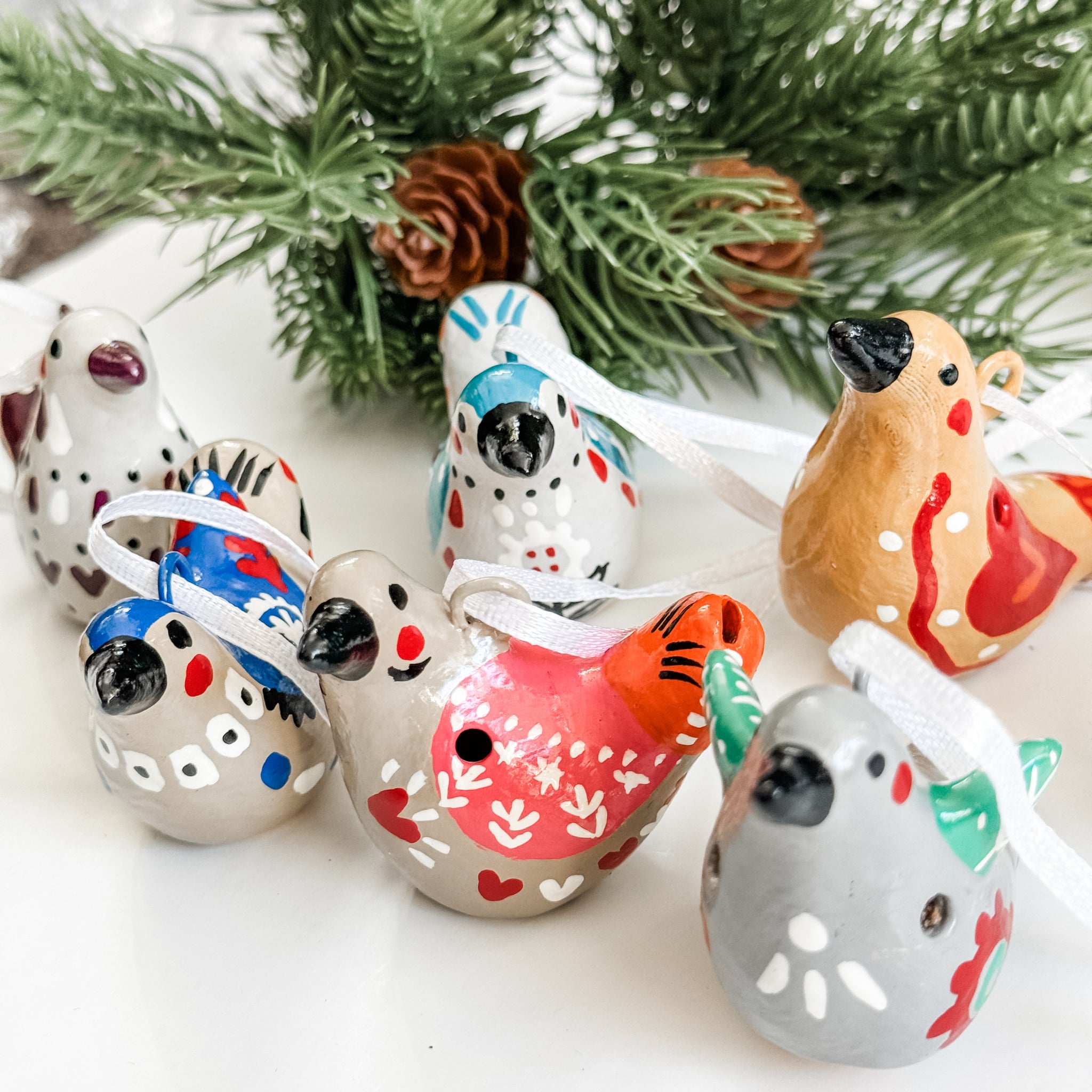 These adorable whimsical bird whistle ornaments are handcrafted from clay by William and his family.