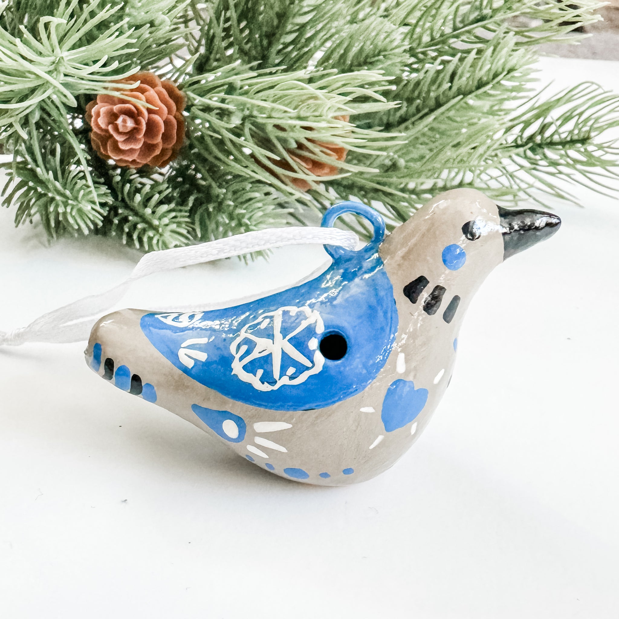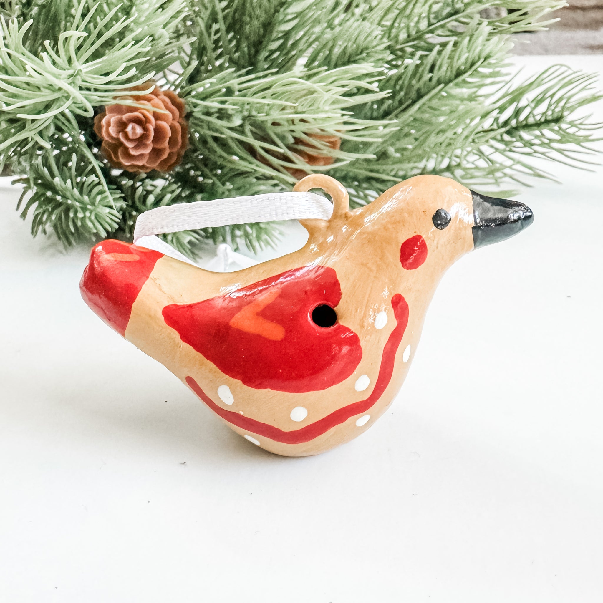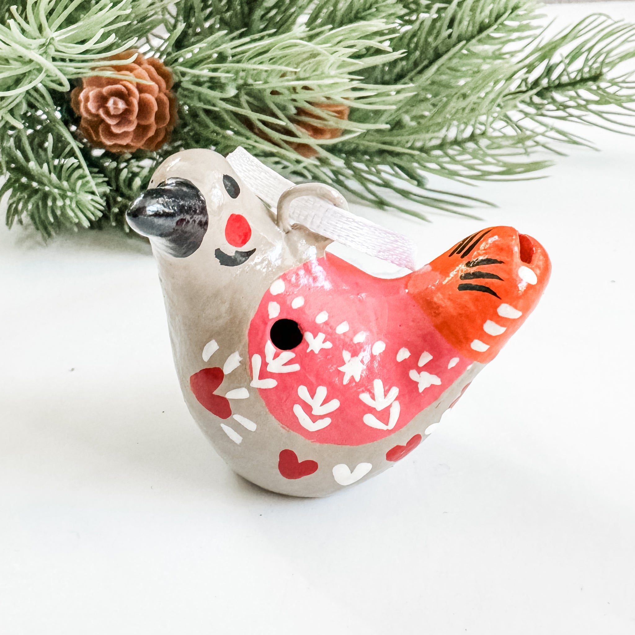 These adorable whimsical bird whistle ornaments are handcrafted from clay by William and his family.