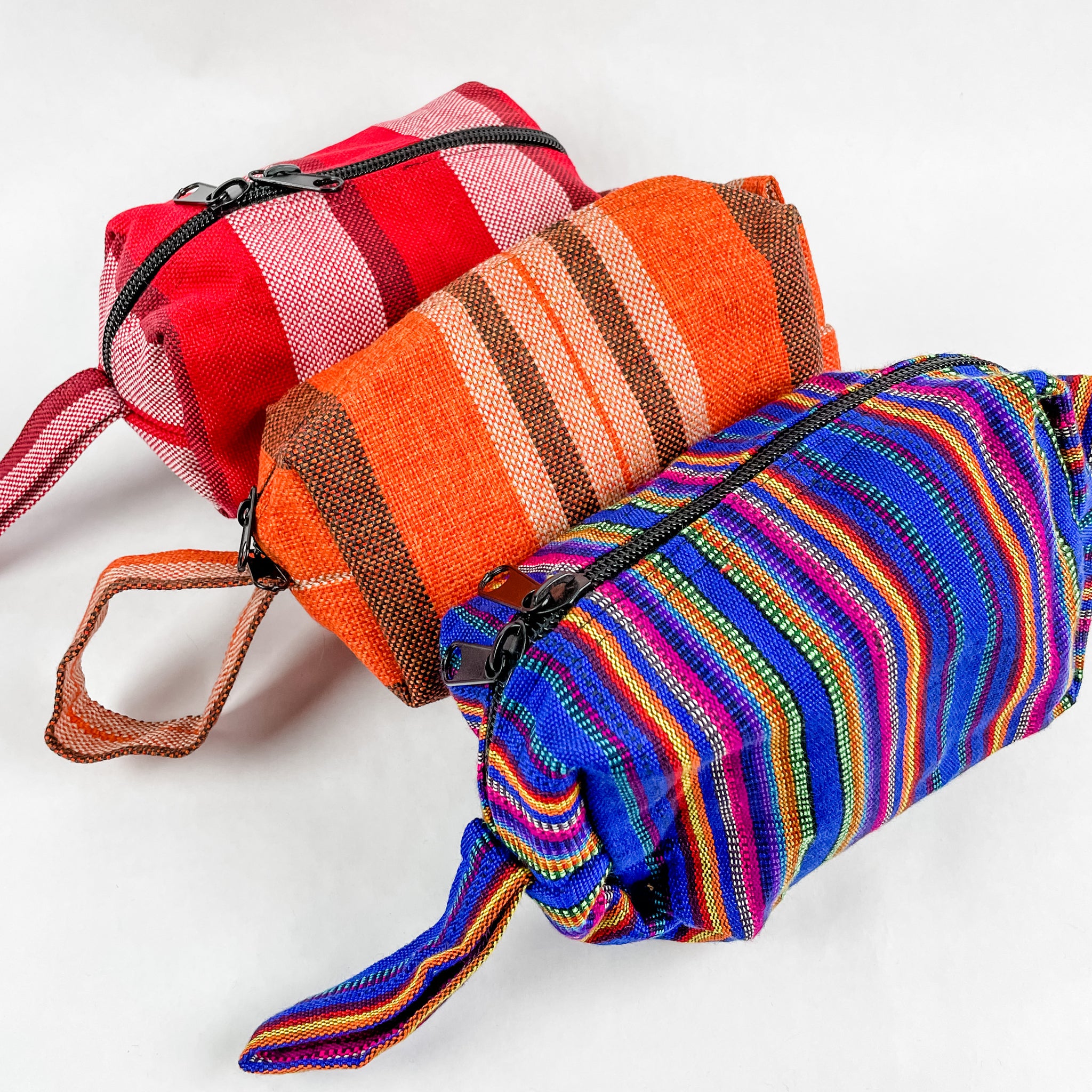 Travel in style with this hand-made, durable toiletry bag! It works great as a cosmetic bag or dopp kit. Contains a sewn-in hook for holding or hanging.