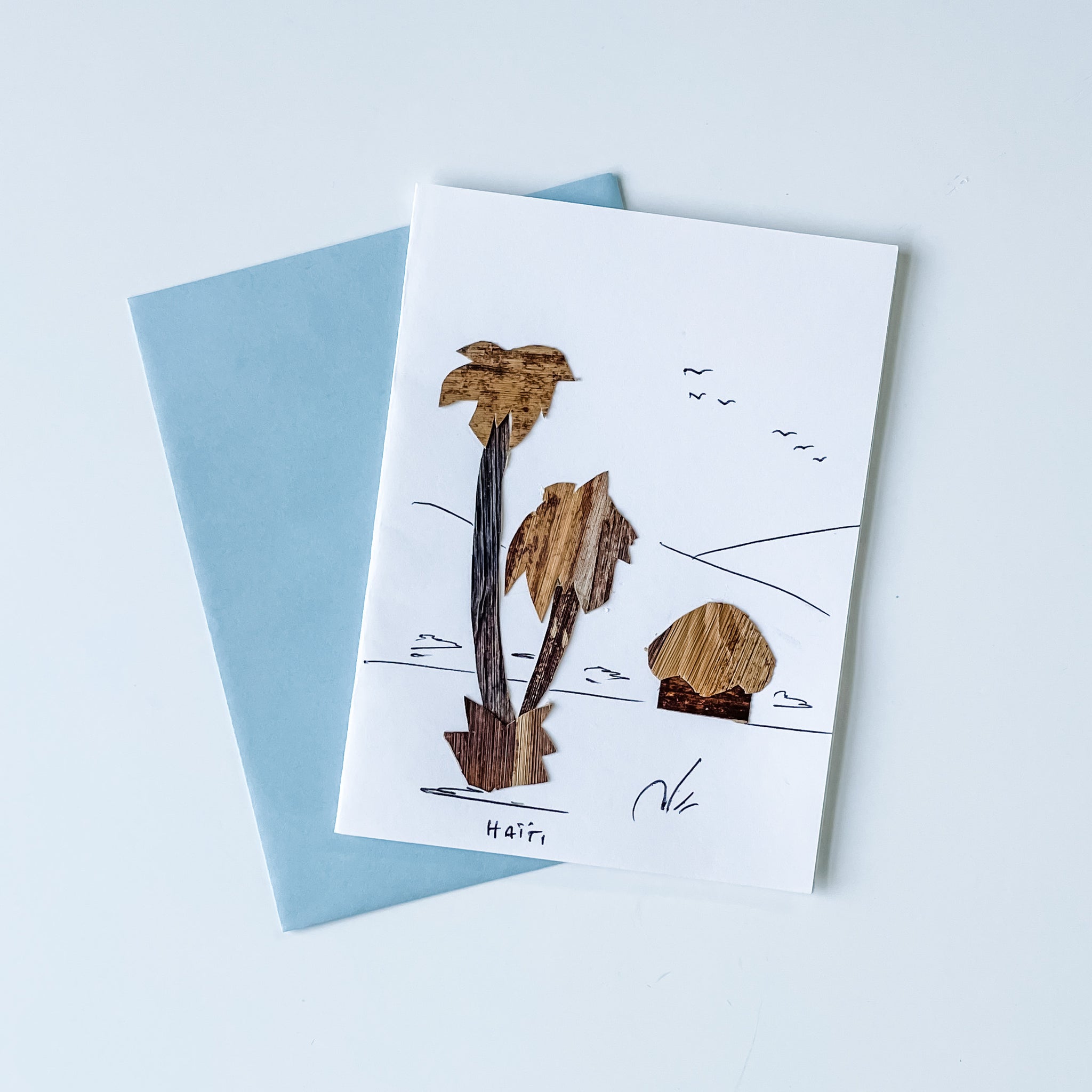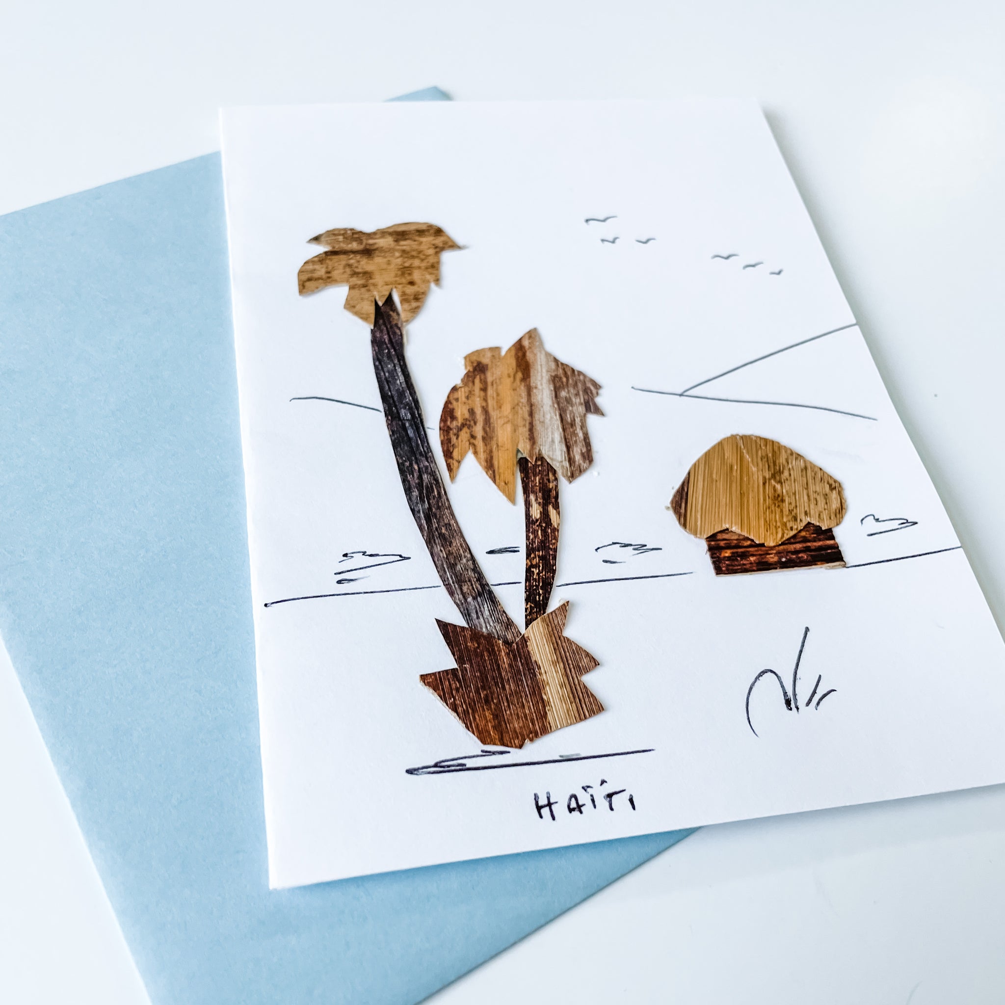 These beautiful, unique cards were created from pieces of banana leaf added to card stock. Students at the Montfort Institute, an orphanage for deaf children in Haiti, make these cards to help pay their school fees and enjoy time together as they create their works of art!