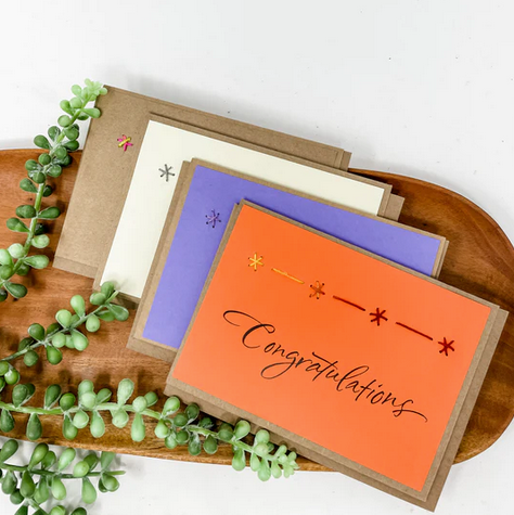 Rosie's greeting cards are hand embroidered with love by mamas in Haiti. Send a congratulatory note to a loved one while providing a job for a mama in Haiti. This beautiful card set comes with 4 greeting cards reading "congratulations" or "congrats" (blank on the inside) with a simple star embroidery pattern, and include envelopes.