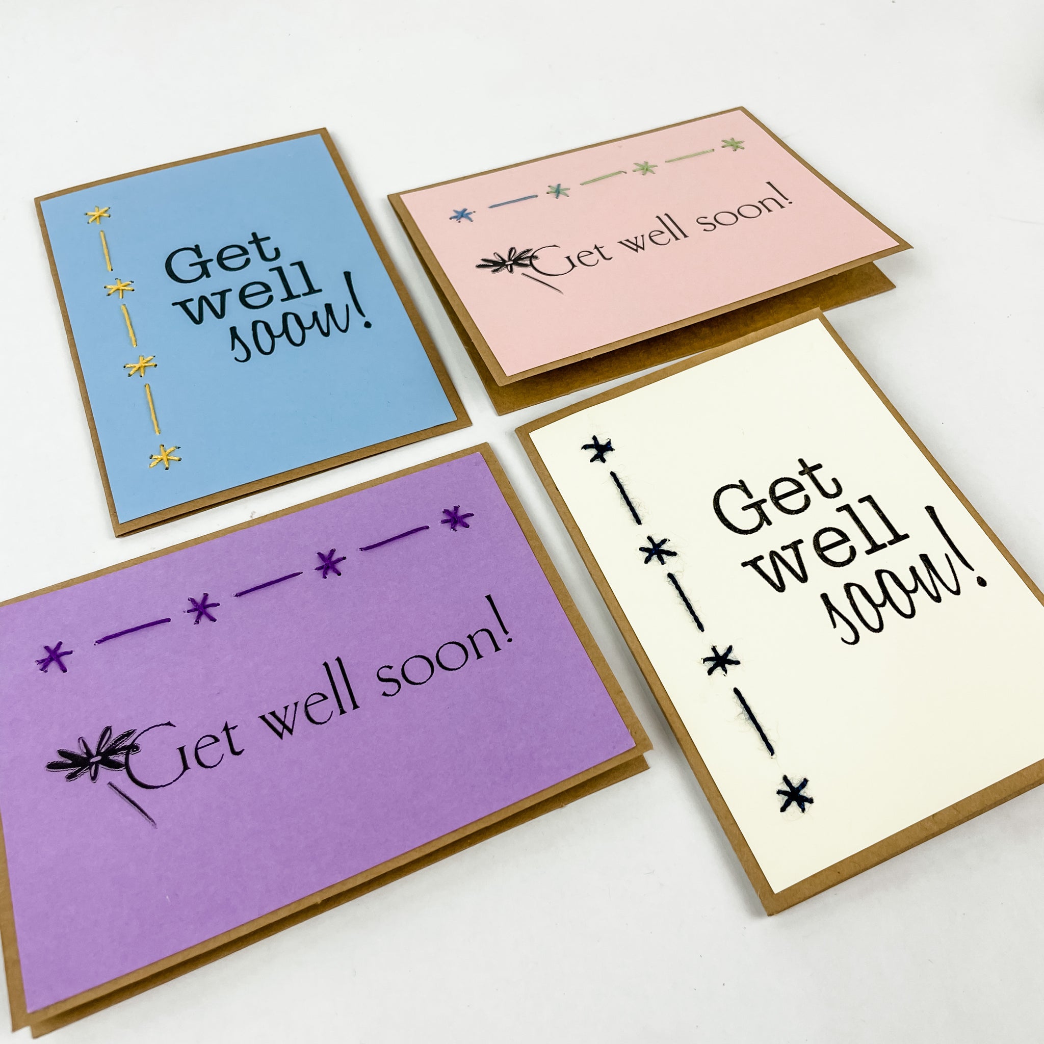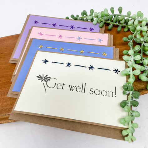 Rosie's greeting cards are hand embroidered with love by mamas in Haiti. Send a note to a loved one while providing a job for a mama in Haiti. This beautiful card set includes 4 greeting cards with two different Get Well Soon designs (blank on the inside) and includes envelopes.