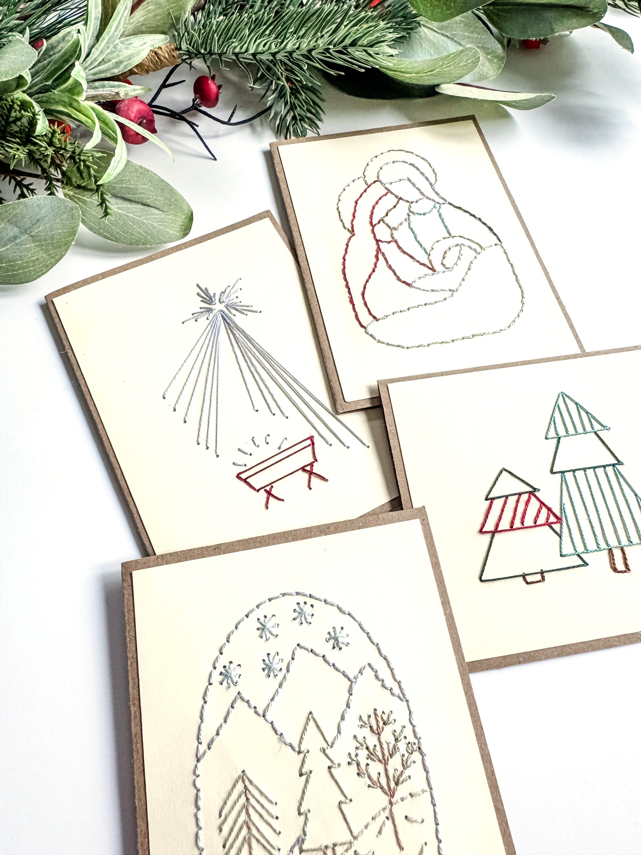 This darling set of Christmas greeting cards includes four cards (blank on the inside) and envelopes.