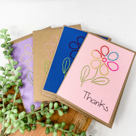 Rosie's greeting cards are hand embroidered with love by mamas in Haiti. Send a note to a loved one while providing a job for a mama in Haiti. This beautiful set of greeting cards includes four cards (blank on the inside) and envelopes.
