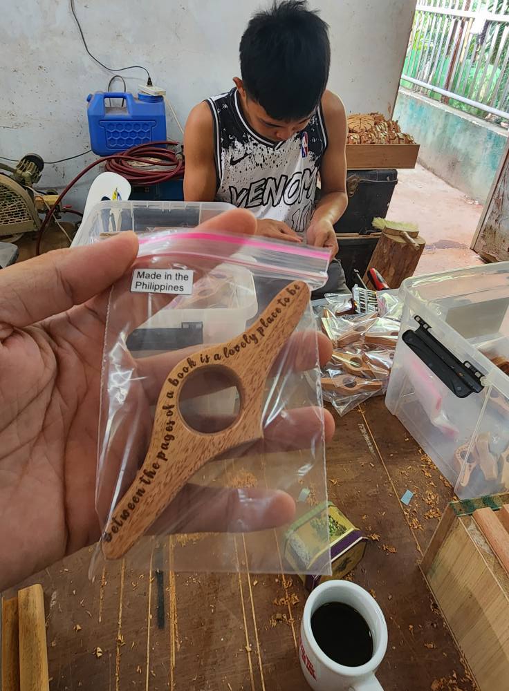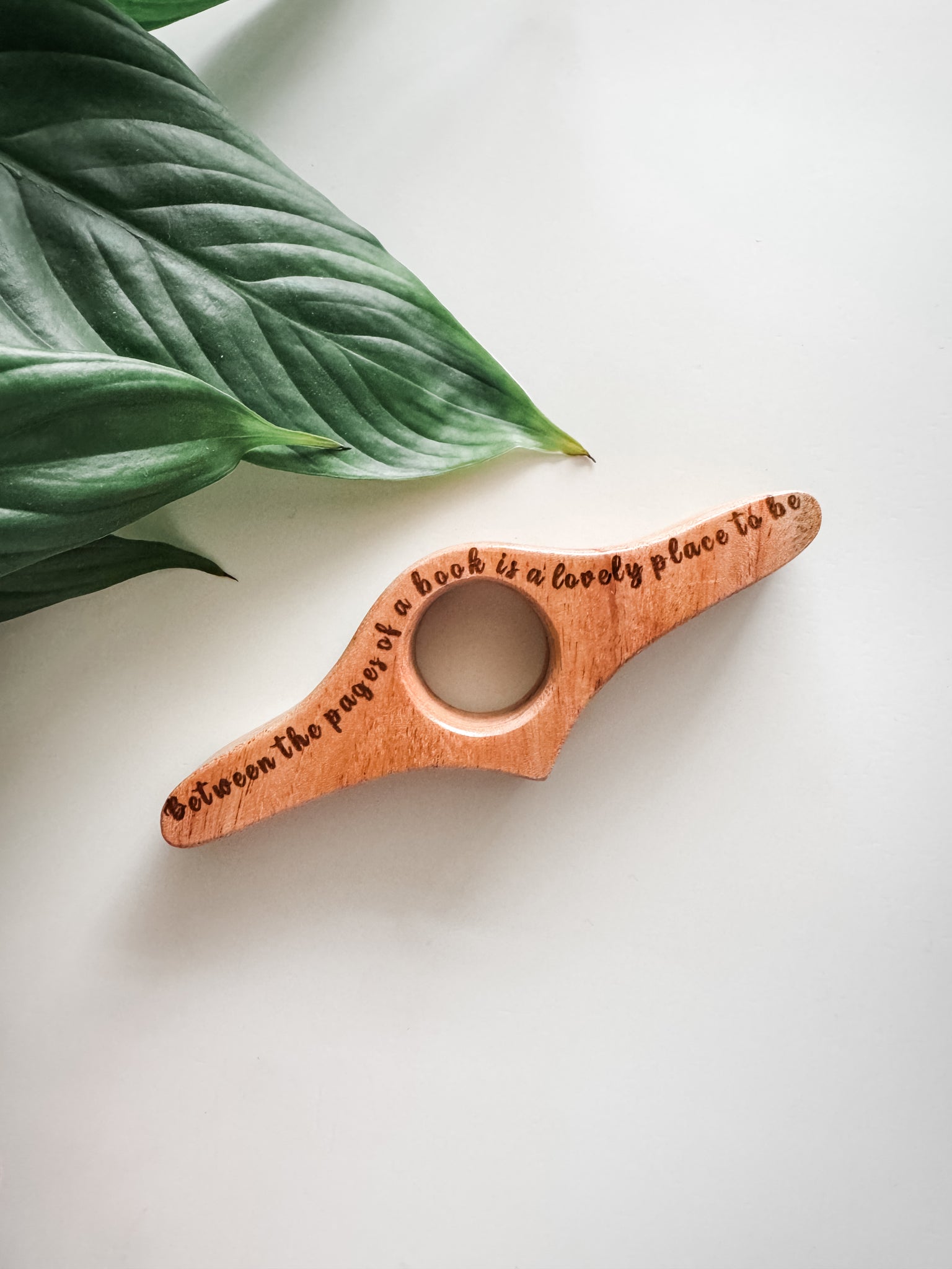Make reading more comfortable with this beautifully crafted One Hand Book Holder, handmade in the Philippines by skilled artisans. Designed to be held in one hand, this simple yet thoughtful tool reduces strain and helps you grip your book more easily for longer, more enjoyable reading sessions. It reads, "Between the pages of a book is a lovely place to be."