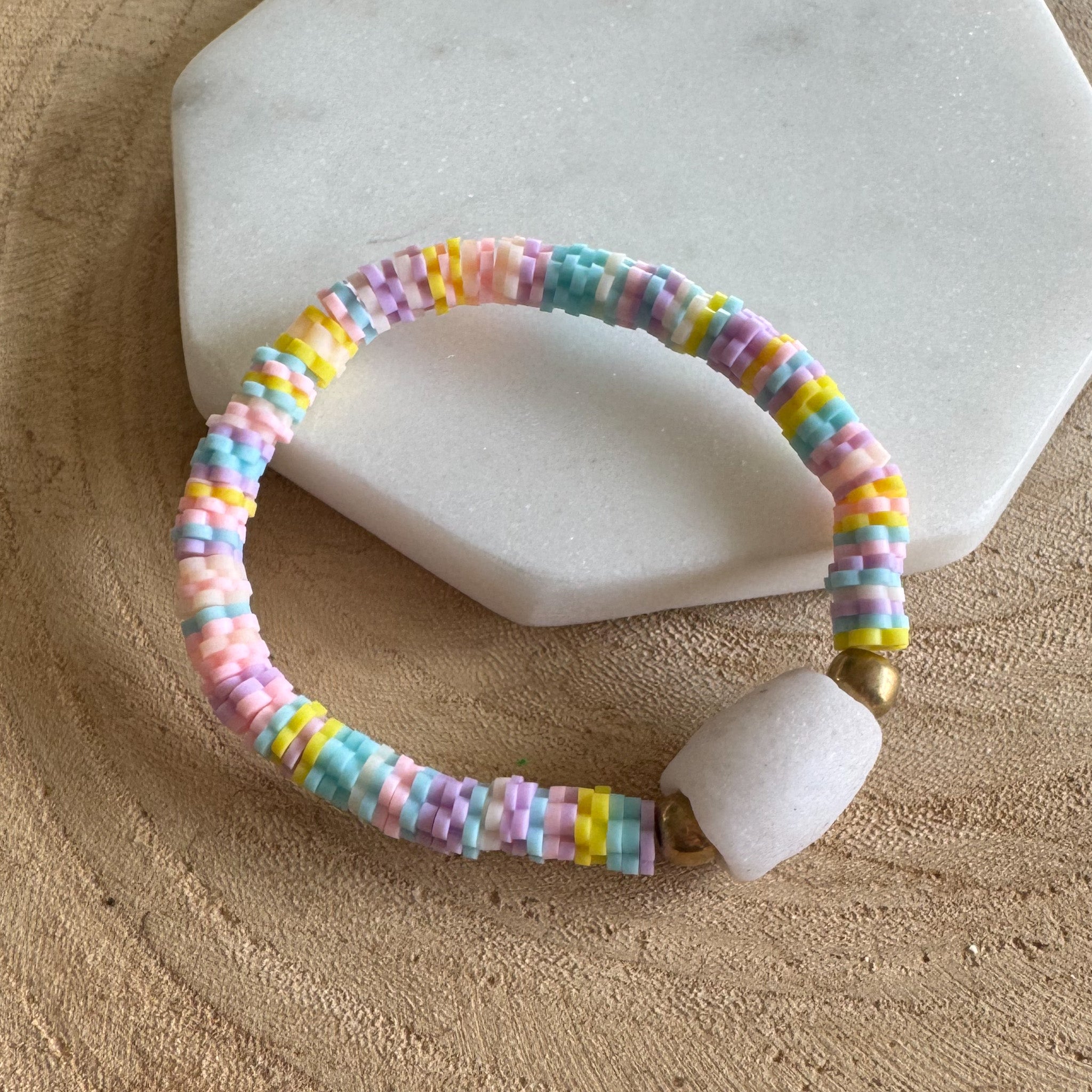 The Vibe Bracelet makes an easy addition to any outfit and the perfect accessory for everyday style. Each stretchy bracelet is hand-made and features polymer clay beads, seed beads, and a cylinder shaped recycled glass bead.