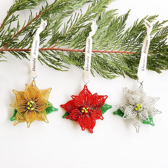 This beautiful poinsettia Christmas tree ornaments were handcrafted by one of the Khutsala Artisans in Eswatini, Africa. FMSC met these talented artisans through our food partner Heart for Africa.