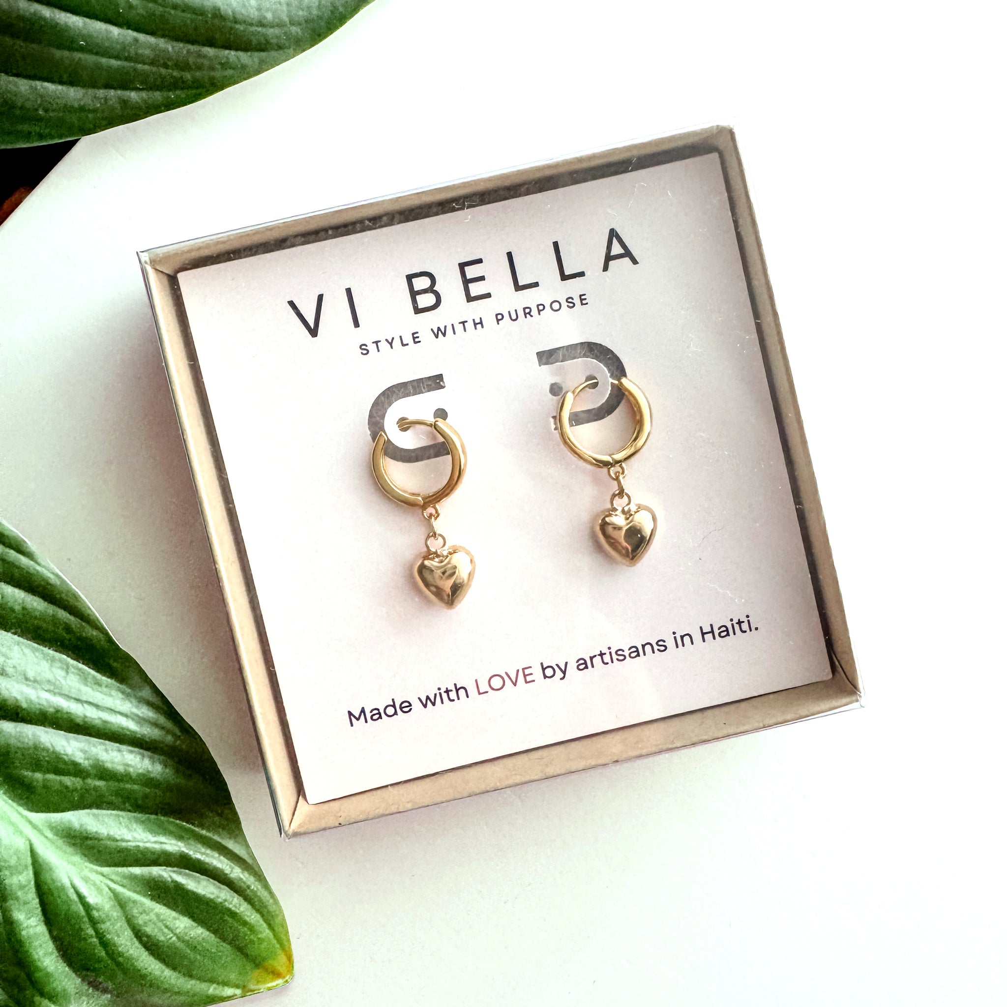 Just the sweetest little gold plated hoops! These puffy little heart charms are popping up all over the place, so it was time to give you an ethical alternative. We think these earrings will be a fun, trendy addition to any outfit, but not too trendy that you can't be wearing these 10 years from now.