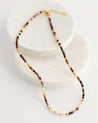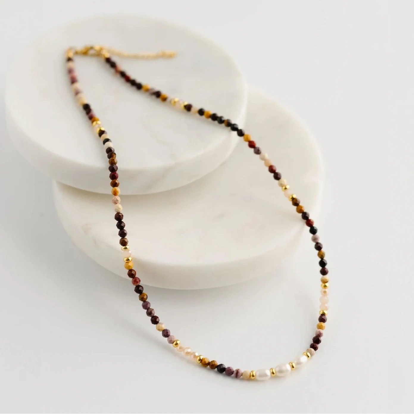 This fun beaded necklace showcases warm fall earth tones with Mookaite Jasper stones, gold-plated spacer beads, and three charming pearl accents at the front. Measuring 16" with a 2" gold-plated extender, it’s the perfect accessory to brighten up your mustard and terra cotta cardigans and cozy long sleeves this season!