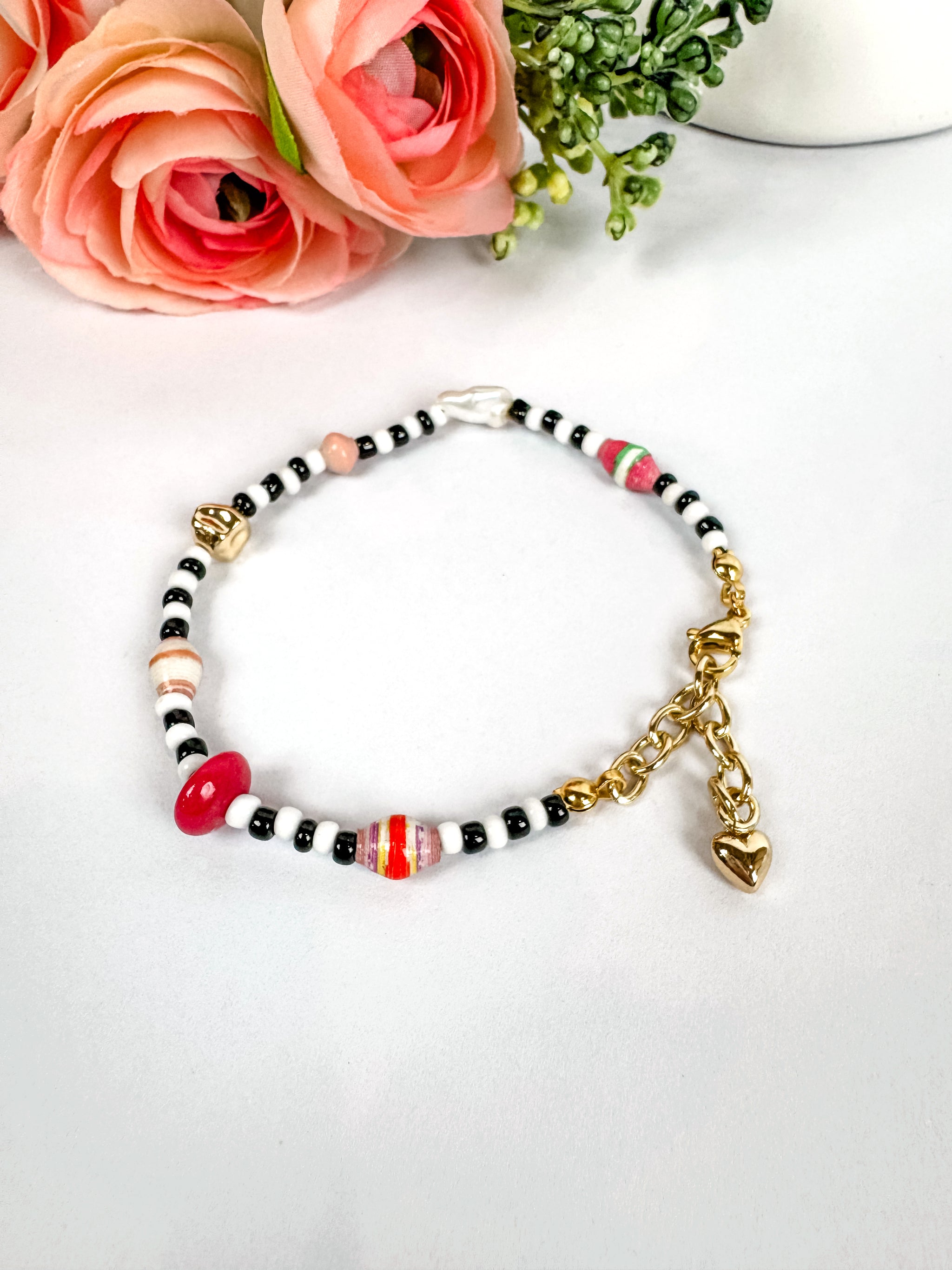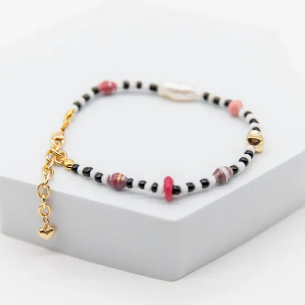 Each bracelet features a fresh water pearl, gold-filled nugget bead, paper beads, and a mini recycled glass coke bottle bead. The chain and heart at the end are gold-filled. This bracelet is 7" long with a 1.5" extender chain to fit most wrist sizes.