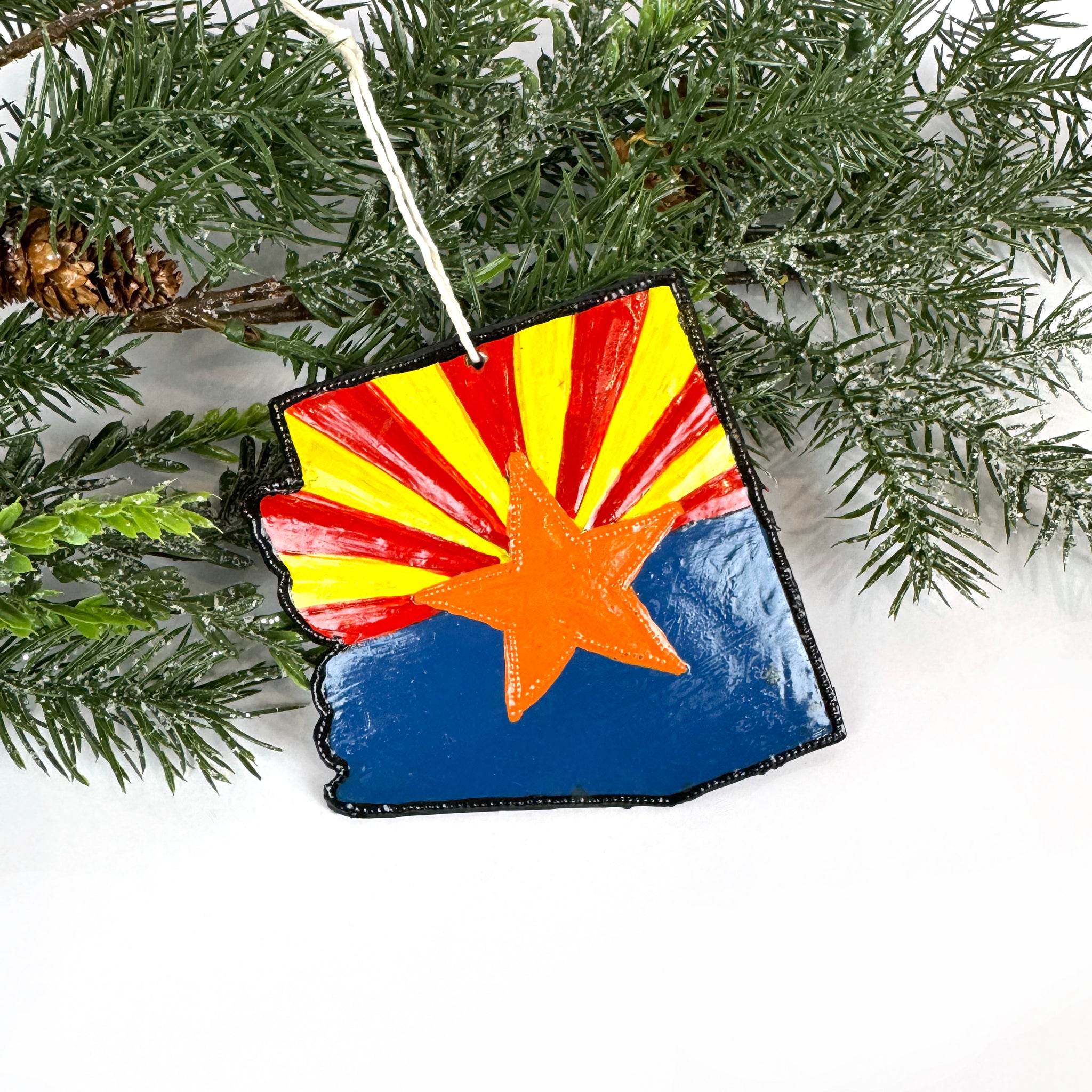 Bring a touch of Arizona pride to your holiday décor with this handcrafted ornament. Made from recycled 55-gallon oil drums, each piece is carefully cut into the shape of Arizona and hand-painted with the vibrant state flag. The result is a unique keepsake that celebrates both artistry and sustainability. Perfect for gifting or for adding a bold Southwest flair to your own tree.