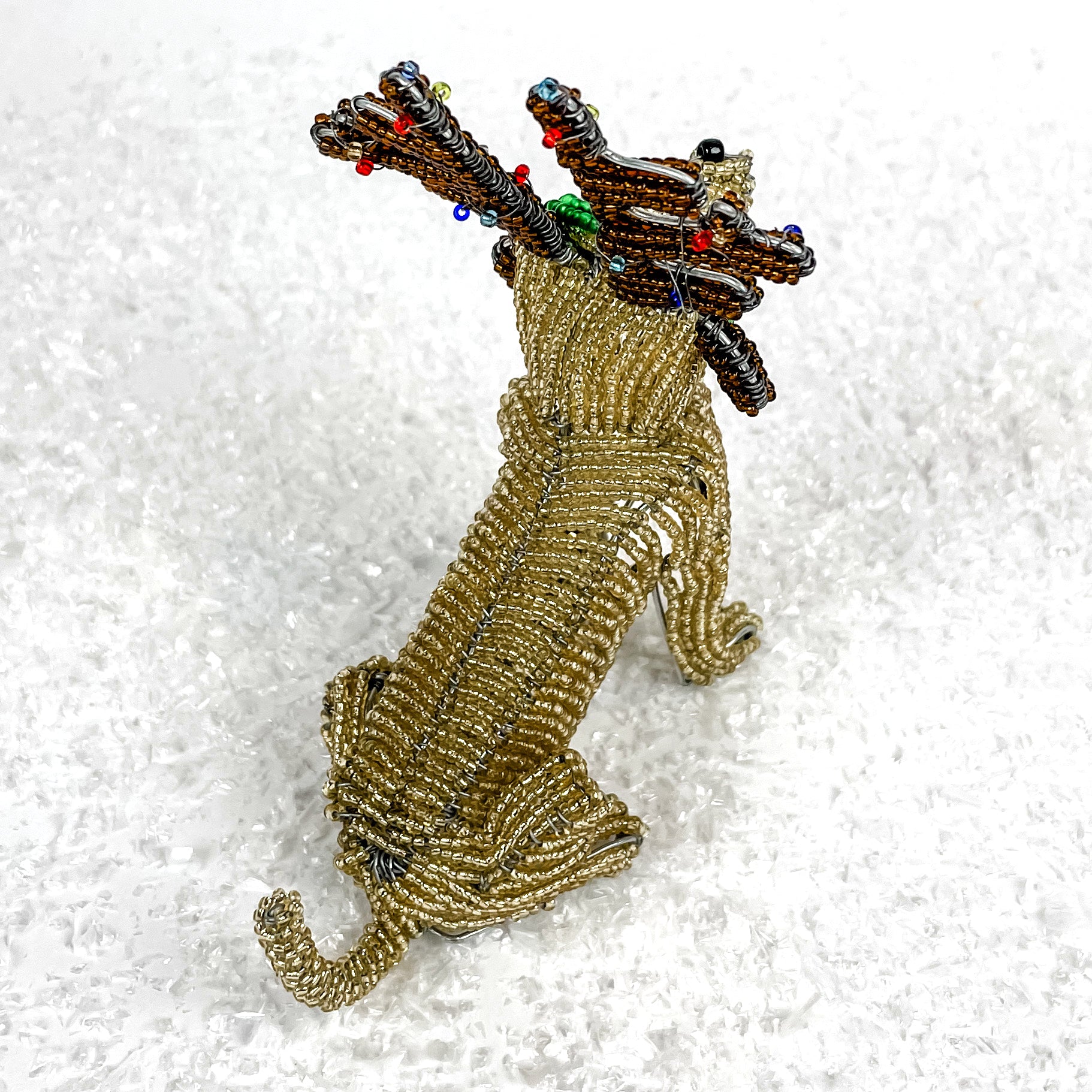 Make a statement this holiday season with this darling one-of-a-kind beaded dog! Hand-beaded in Eswatini by the Khutsala artisans, this unique decor piece will give your home a touch of playful attitude and a festive charm. Who knew you could find a canine with antlers? Get it while it’s hot!