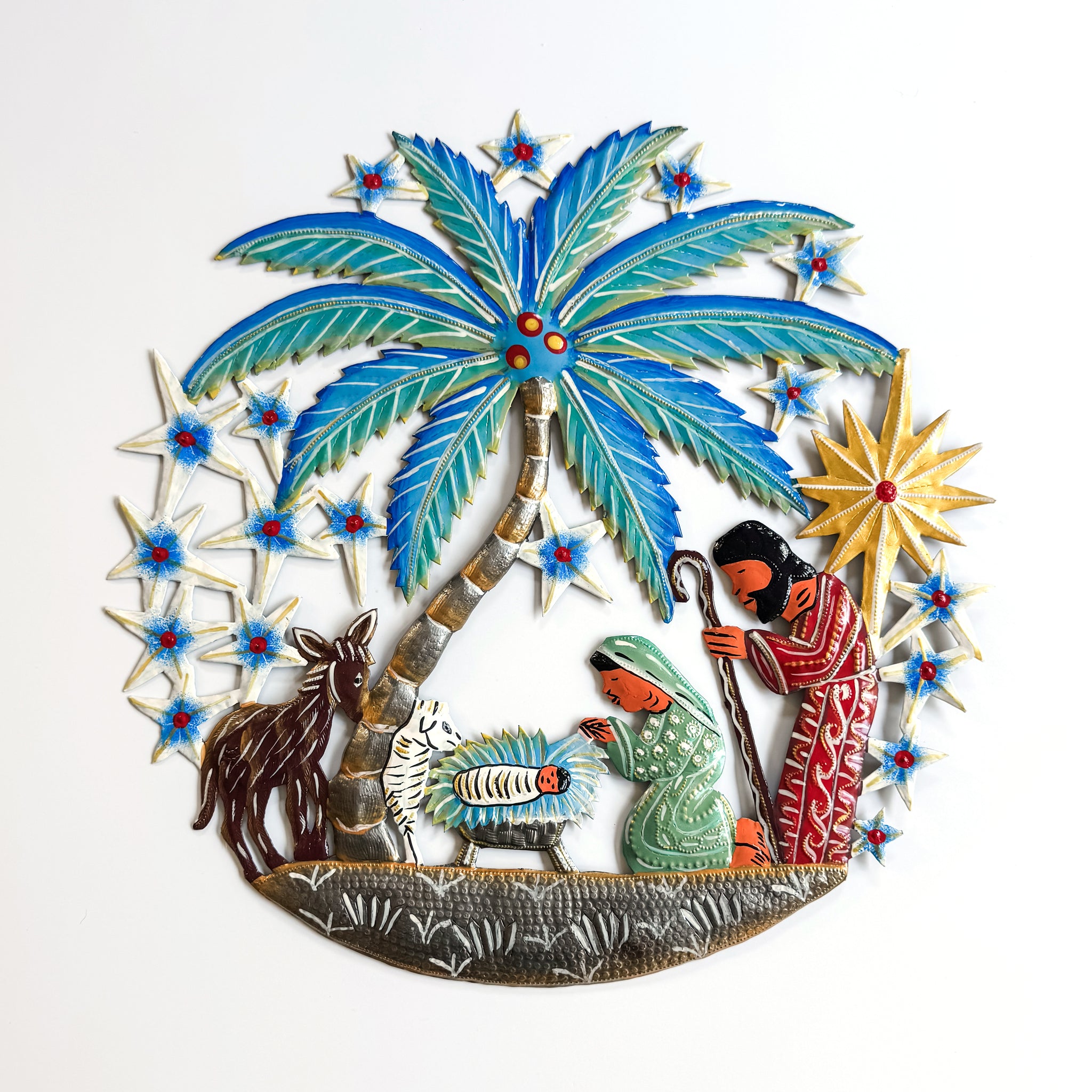 The Celebration in the Heavens Oil Drum Nativity is a stunning work of Haitian artistry, handcrafted from recycled oil drums. Skilled artisans cut, shape, and emboss the metal to create a radiant nativity scene framed by swirling stars and heavenly detail. Both rustic and elegant, this piece captures the joy of Christ’s birth while honoring the creativity and resilience of Haiti’s artisans. A meaningful addition to your holiday décor, it’s a keepsake that celebrates faith, beauty, and tradition.