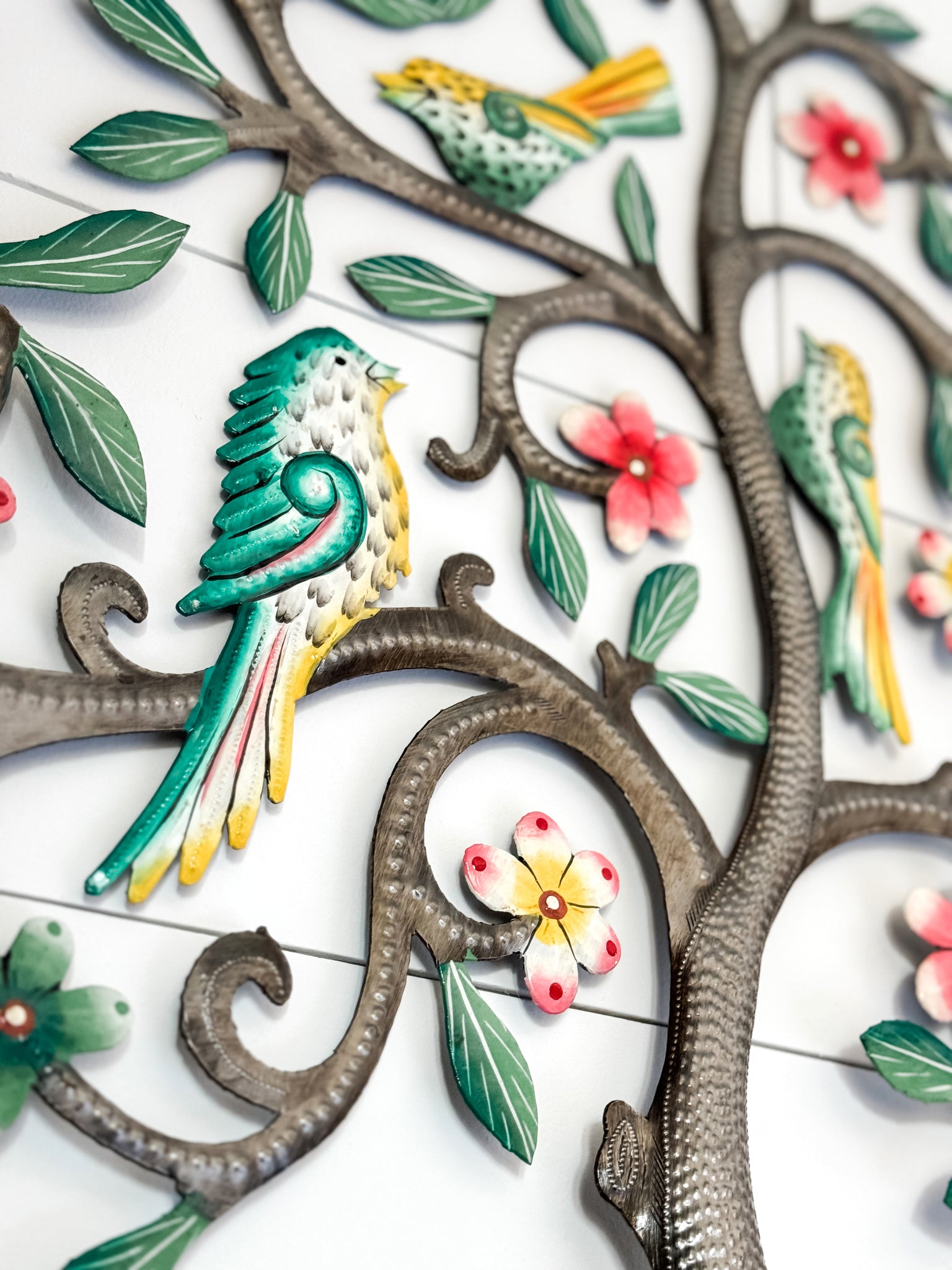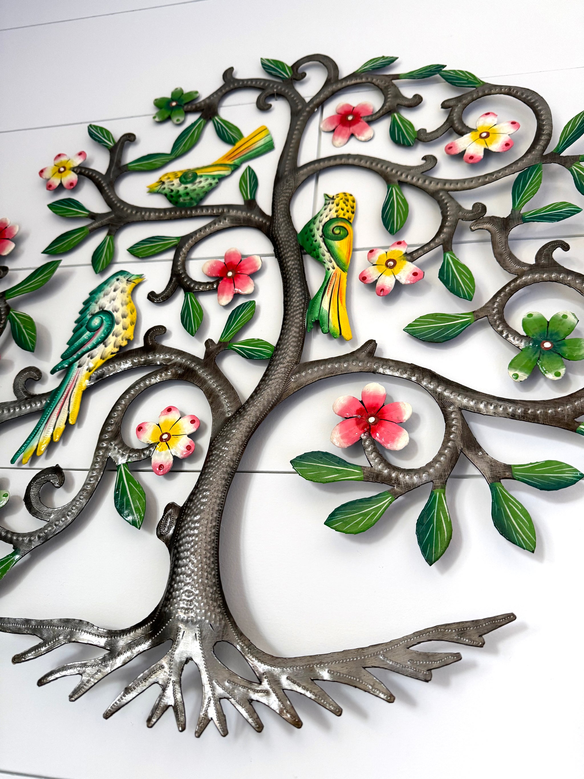 This unique art piece is handcrafted from recycled 55-gallon oil drums oil drums by artisans in Haiti. Expertly crafted, the Cherry Blossom Oil Drum Art will bring a touch of beauty to any home. Richly textured with vibrant colors, this piece is sure to be a beautiful focal point.