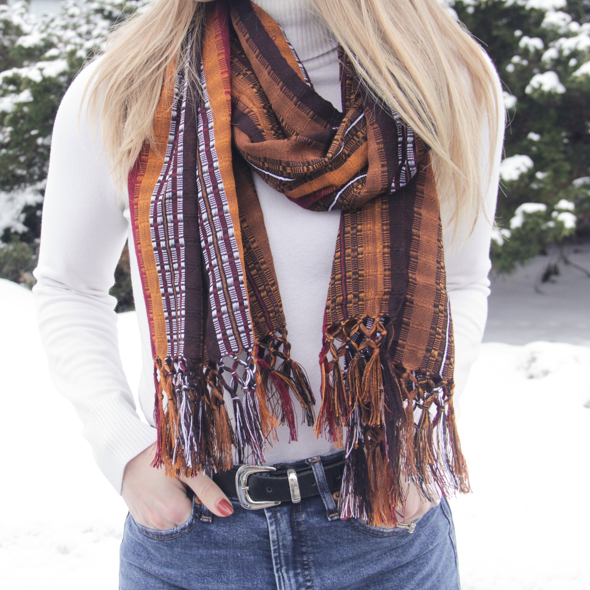Scarves are multi-colored and may slightly vary from pictured scarves.