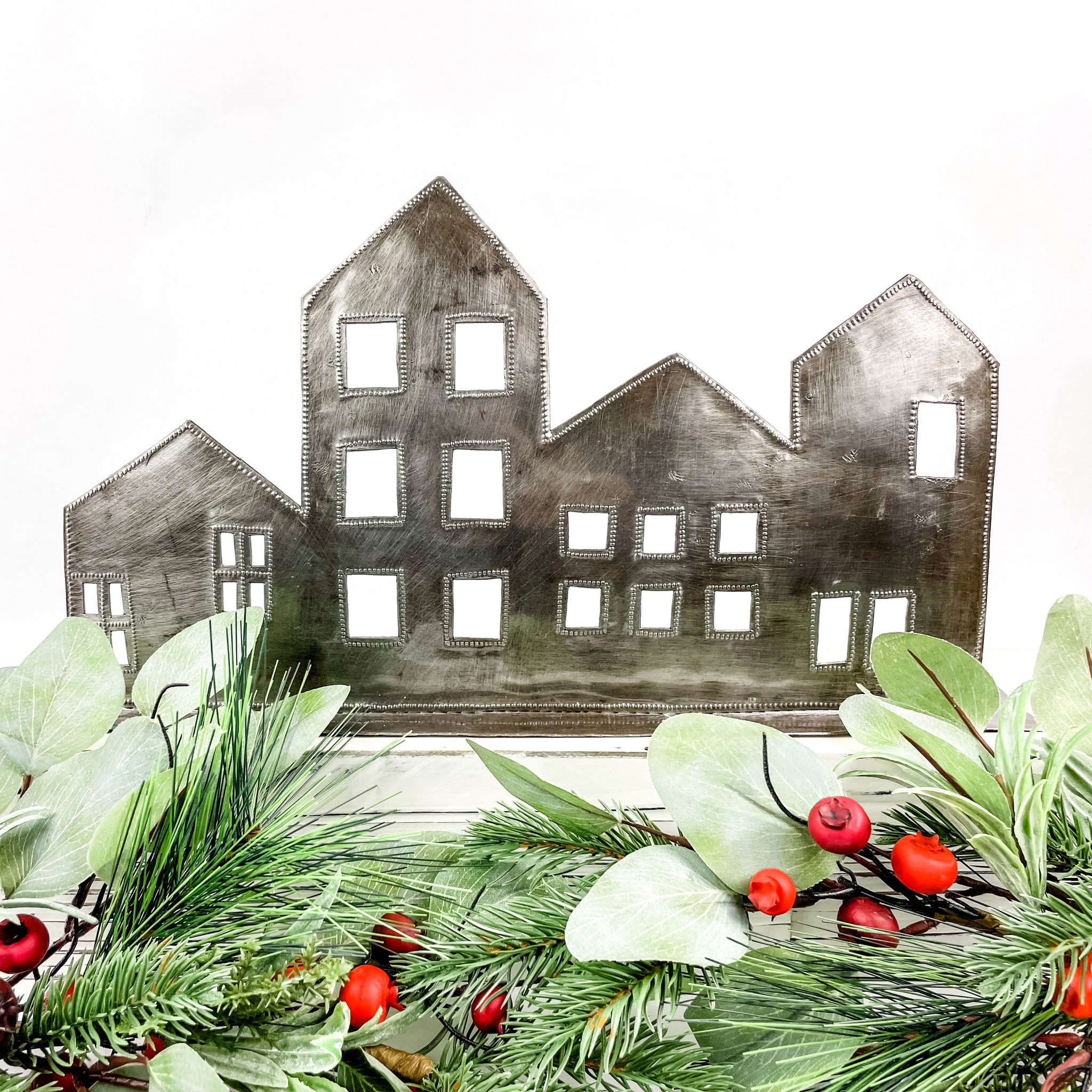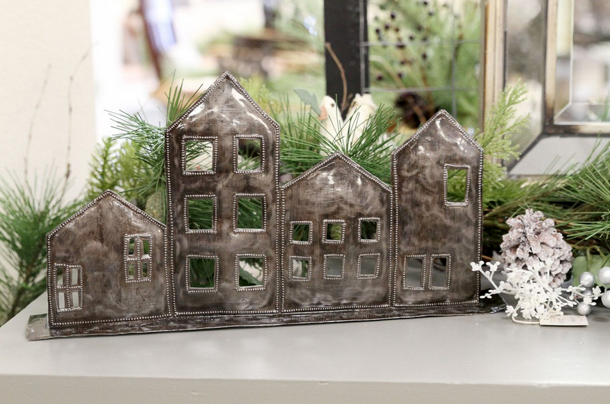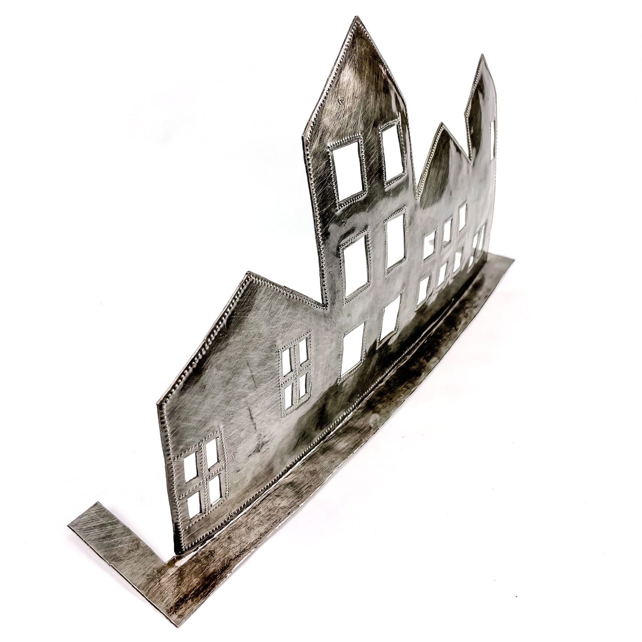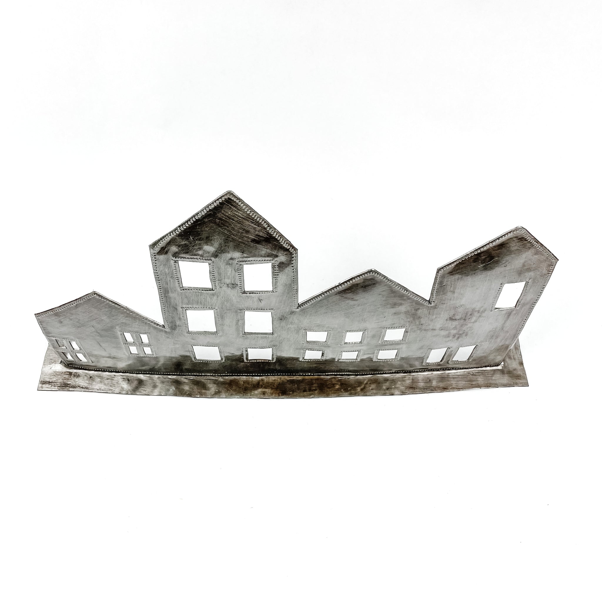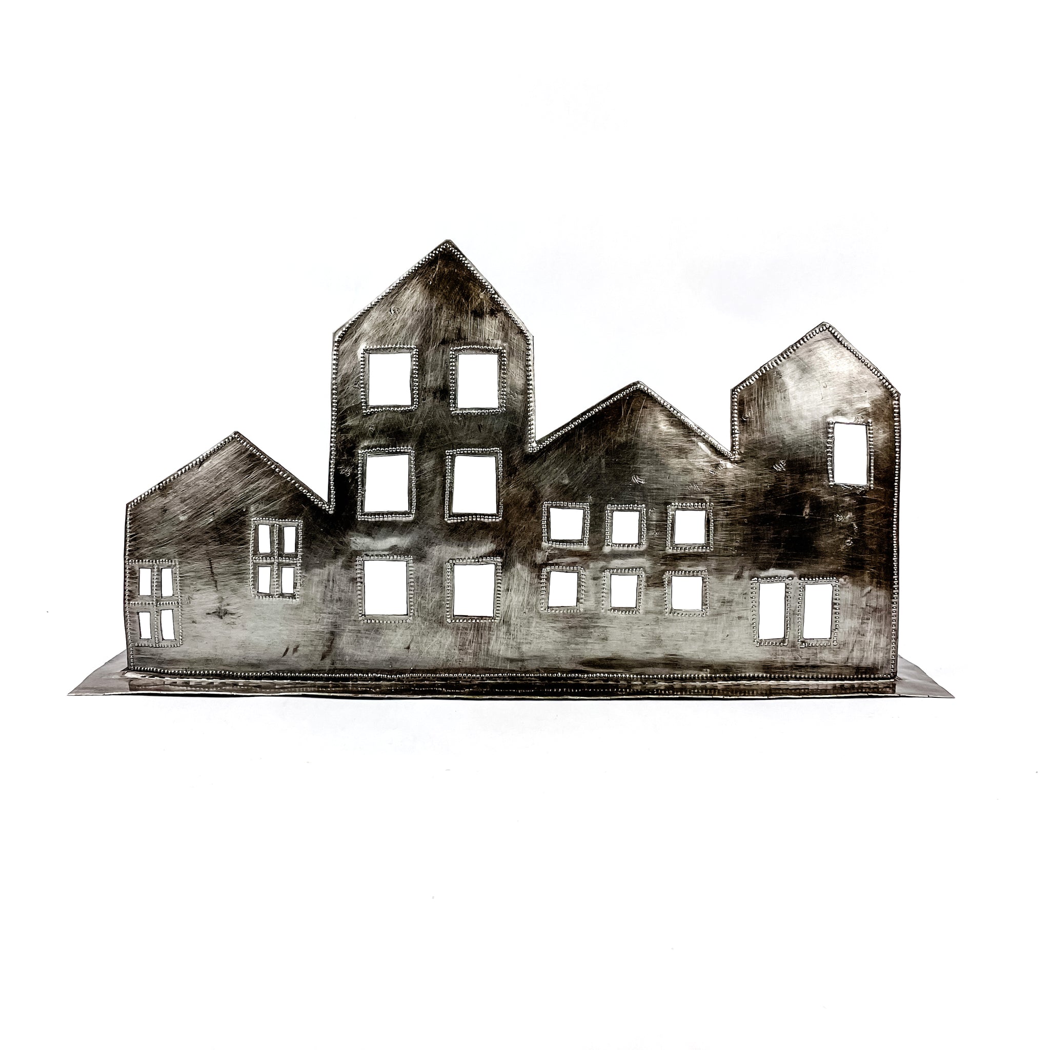 Handcrafted in Haiti, the Houses Standing Metal Art adds a unique touch to any space. Made with care and attention to detail, each piece is created with a hammer and chisel from recycled oil drums and showcases the beautiful craftsmanship of Haitian artists. Handmade in Haiti by Jhonson and his team of metal artisans.