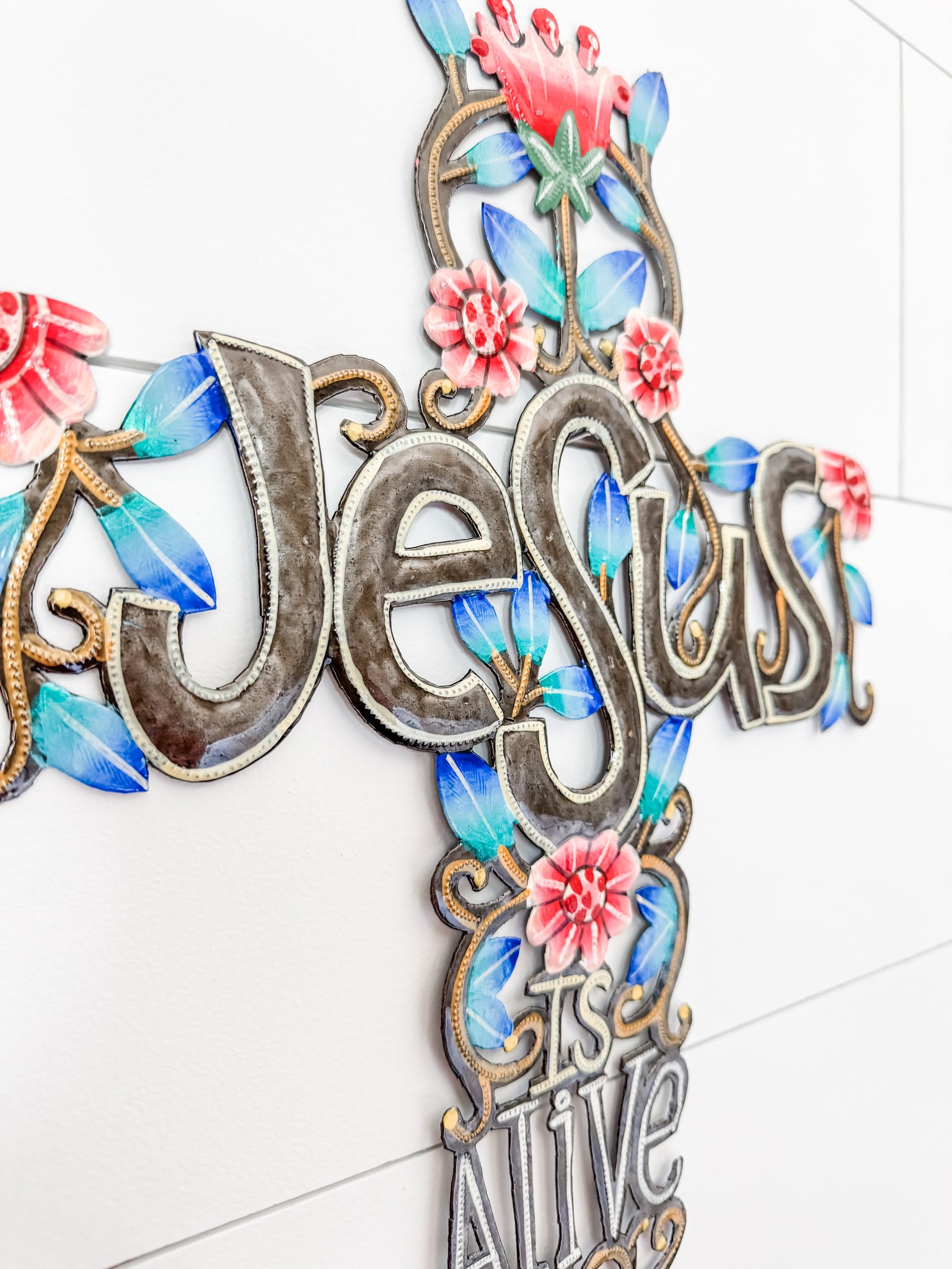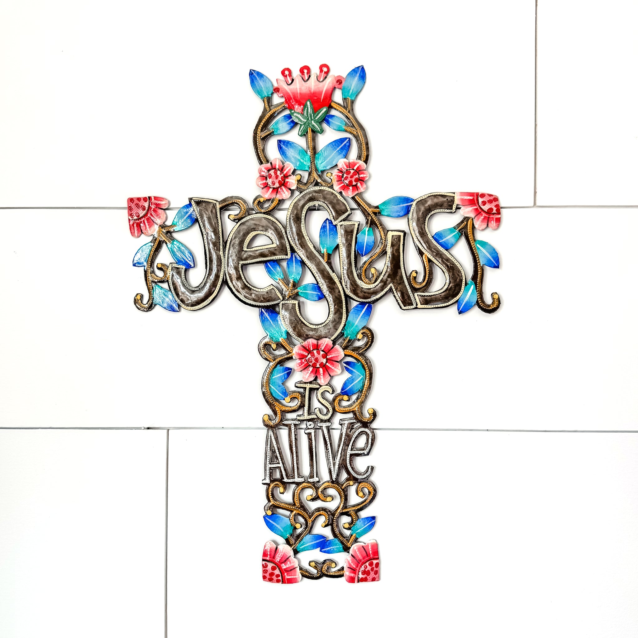 Experience the joy of Easter with this Jesus is Alive Haitian Metal Cross! This beautiful and unique cross celebrates the resurrection of Jesus and serves as a powerful reminder of His everlasting love. Handcrafted in Haiti, each cross brings hope and inspiration to your home.