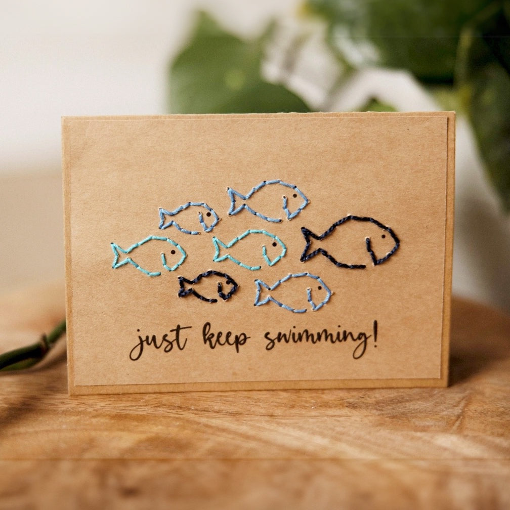 This set of four hand-stitched cards with envelopes features adorable fishies in multiple blue tones and the phrase, "just keep swimming."