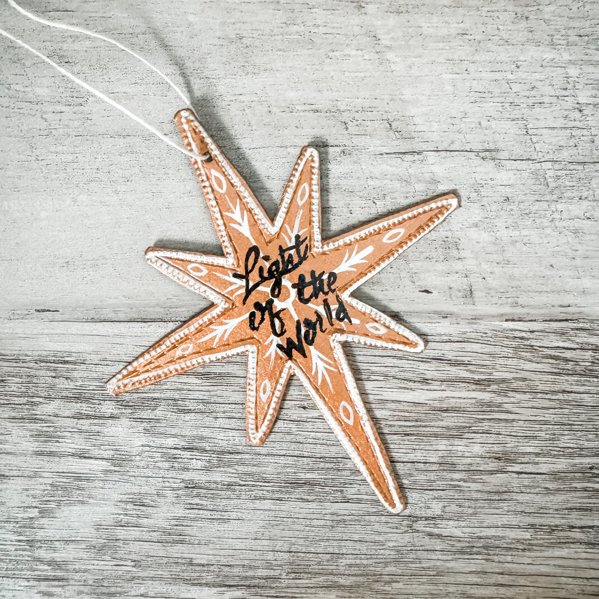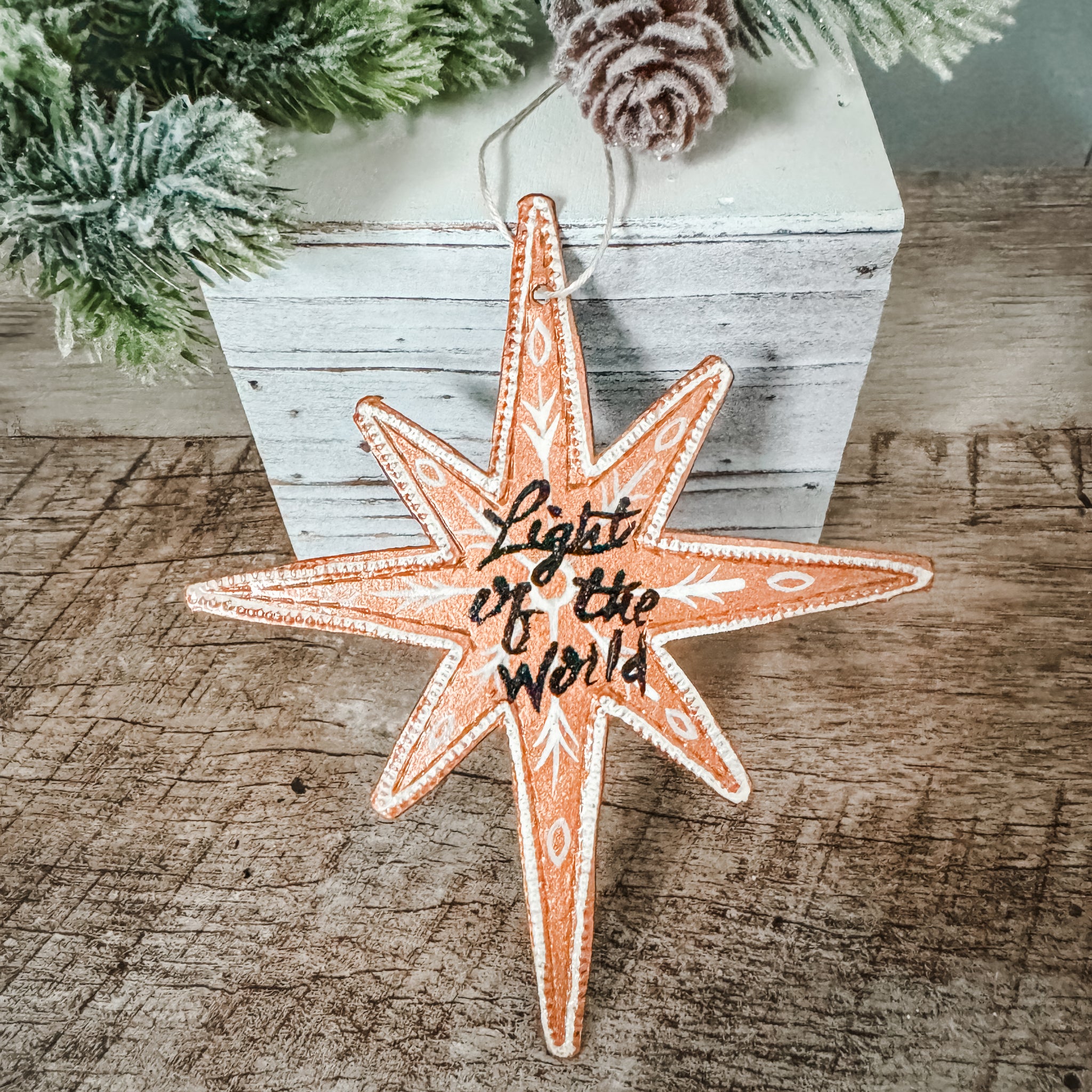 This stunning metal star ornament will add a touch of elegance to your Christmas tree. Each one is handcrafted in Haiti, making it a unique and meaningful addition to your holiday decor. Bring the light of the world to your home this season with this exquisite ornament.