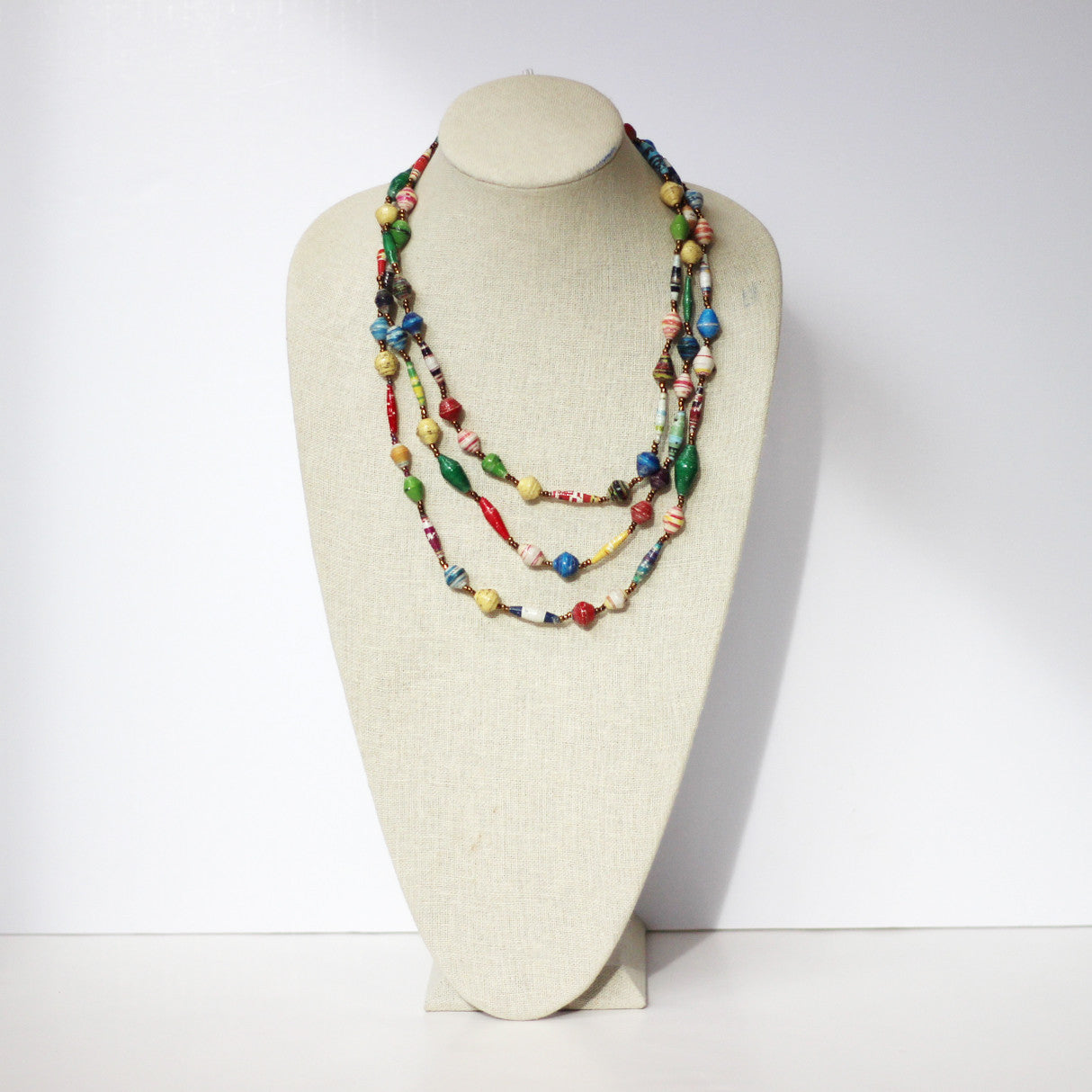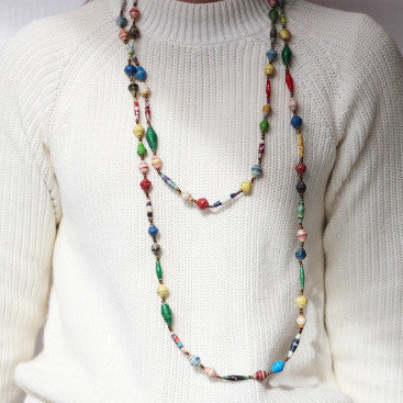This beautiful, long necklace was handmade by the Hope Again Women’s Project in Rakai, Uganda – where the first case of AIDS in the world was diagnosed. The women cut recycled magazines into strips, roll them into beads, and then shellac them.