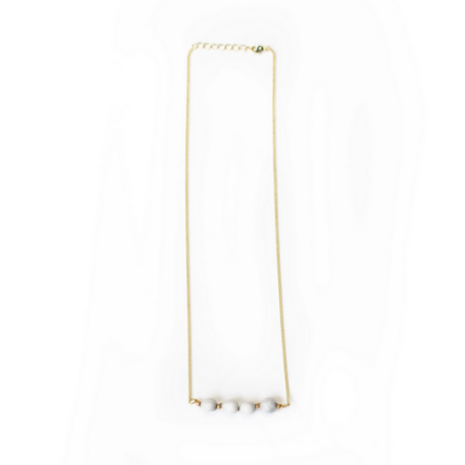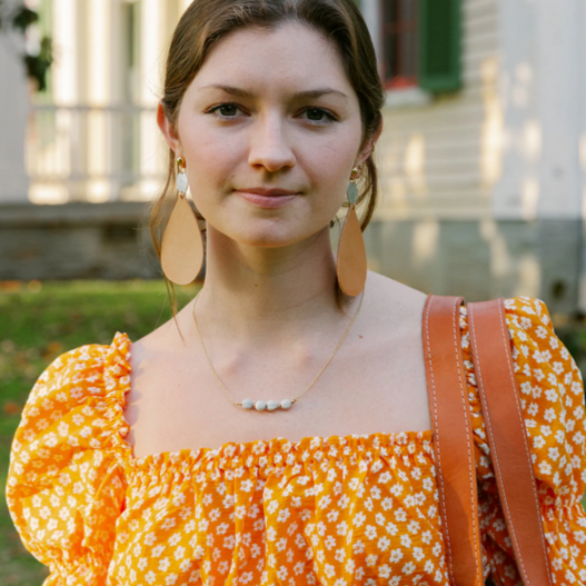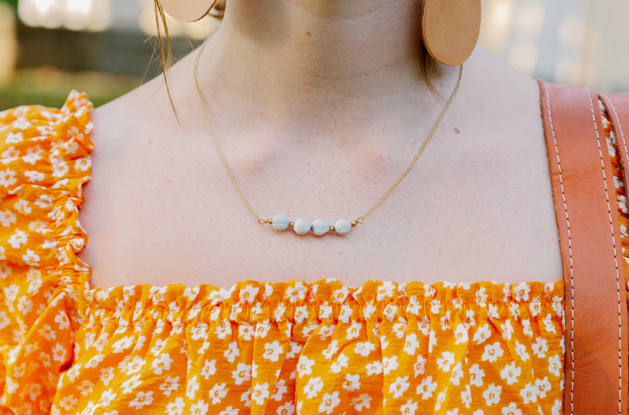 This handmade Majok Necklace can be your new everyday staple; the gold chain with white-gray beads means this can go with literally anything! Hand-dyed, locally-sourced majok seed beads hint at the natural beauty of Haiti, while the short adjustable chain means it can hang at the perfect length with each outfit.
