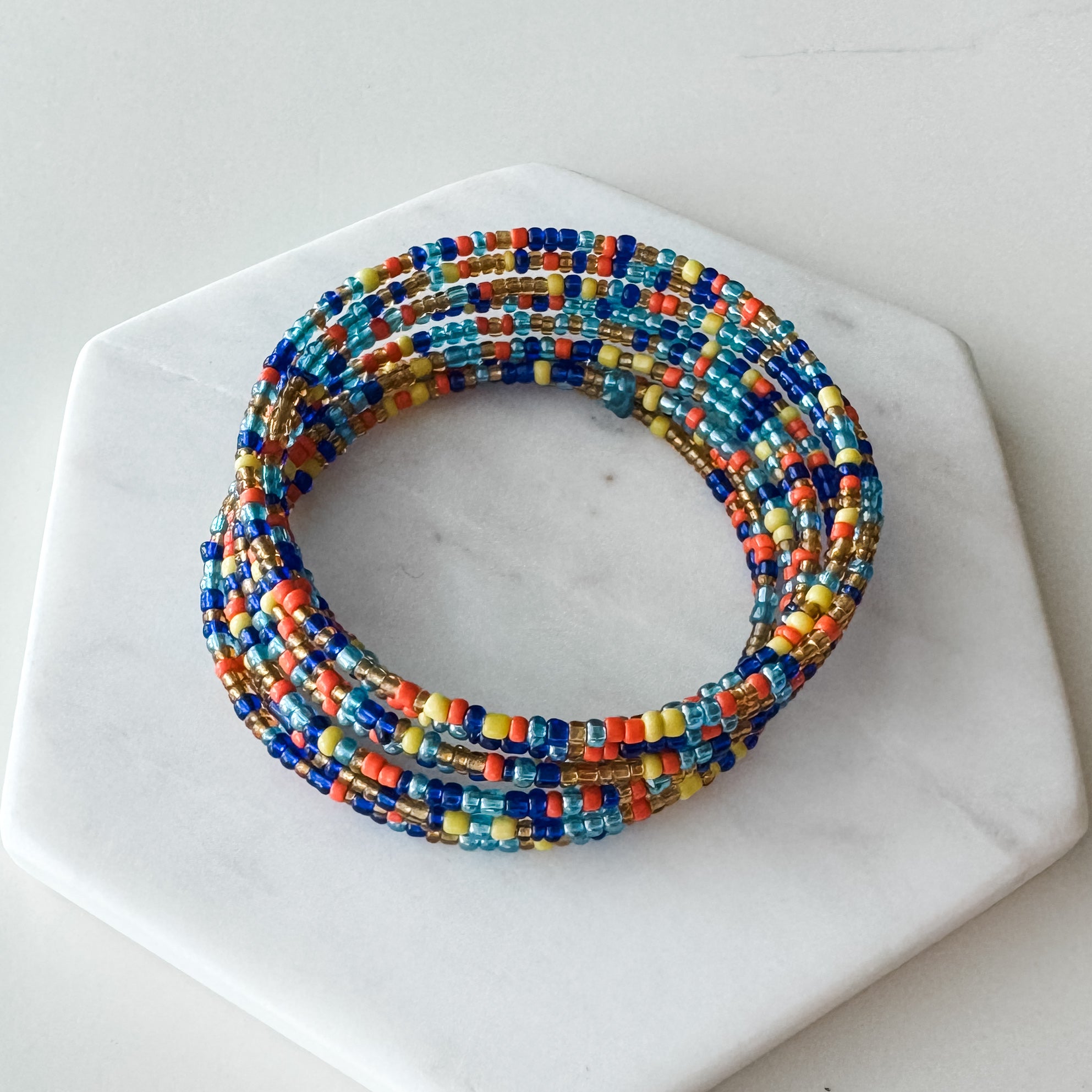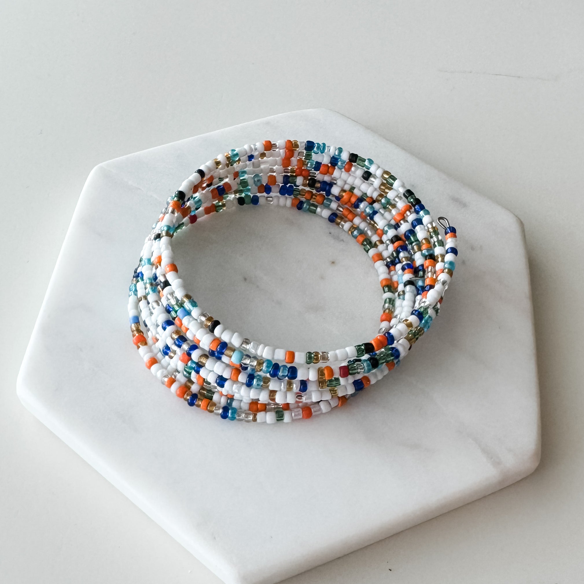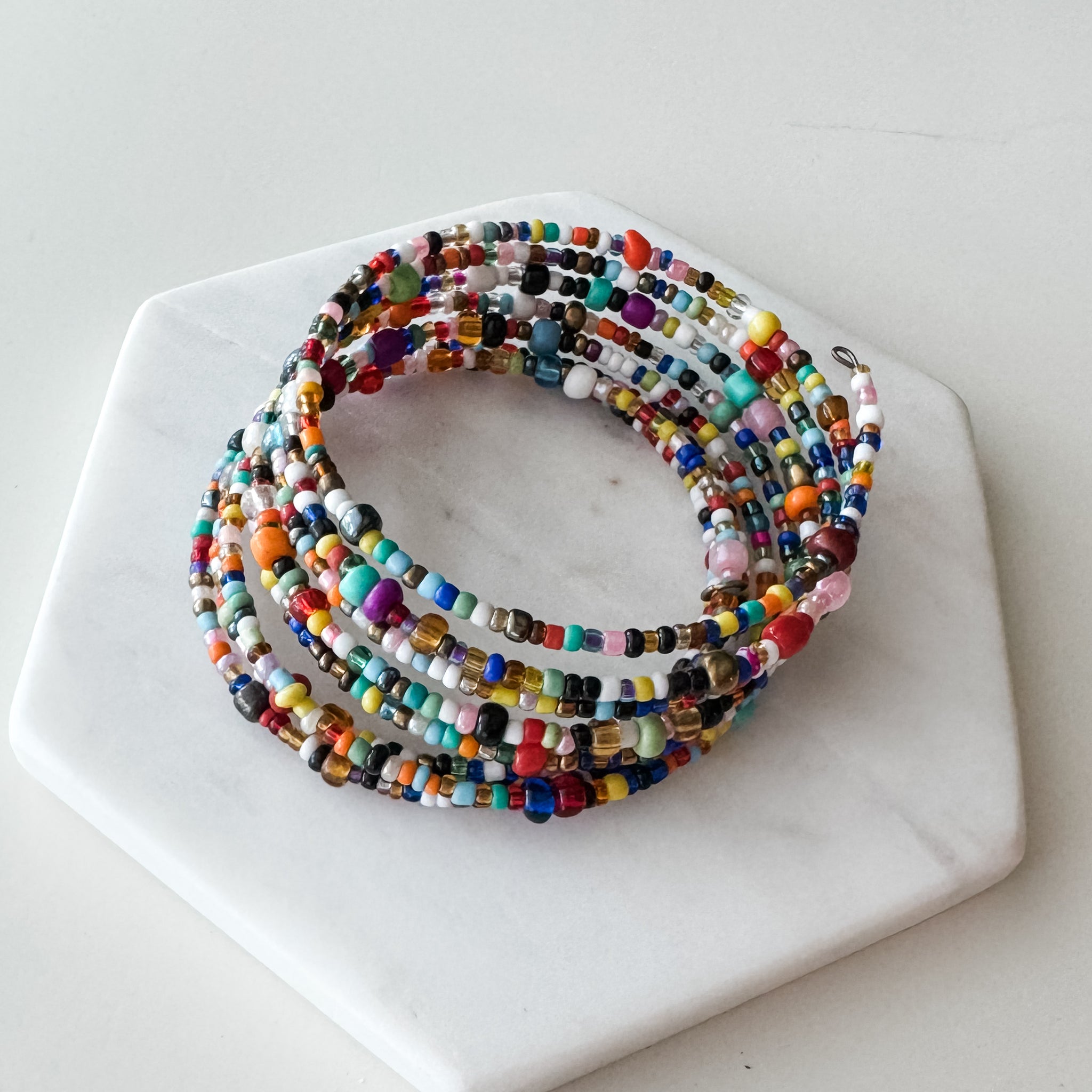 This hand-beaded multicolor wrap bracelet adds a touch of bohemian style to any outfit. Each bracelet is carefully crafted for a unique and eye-catching design. Elevate your accessory game and make a statement with this one-of-a-kind bracelet.
