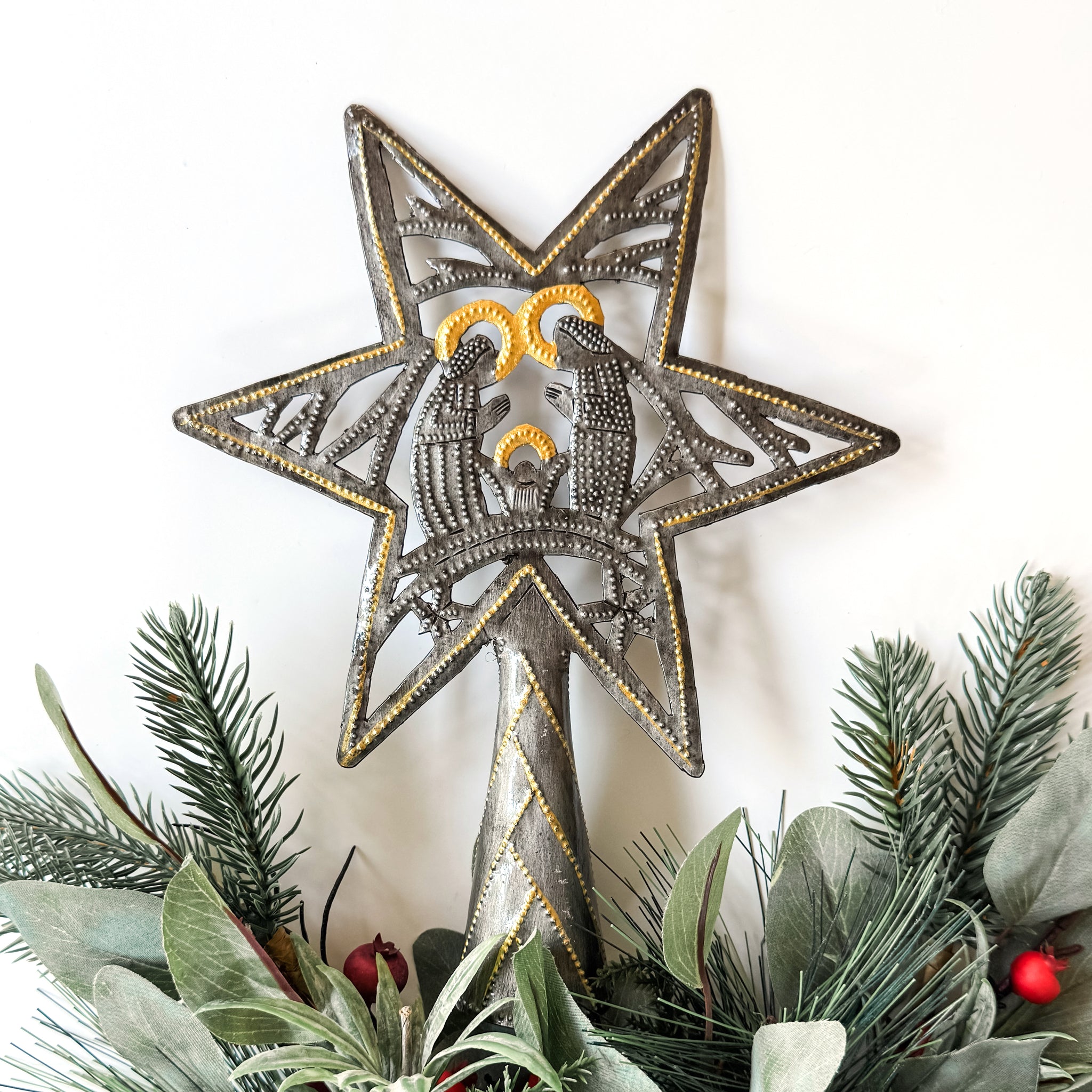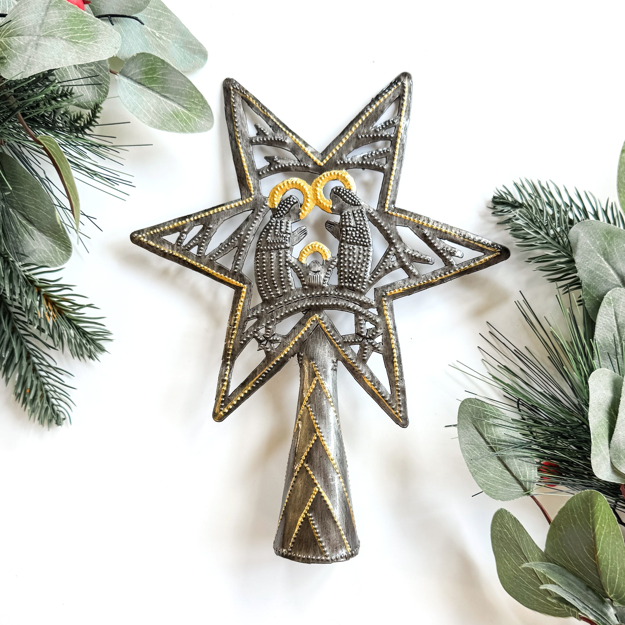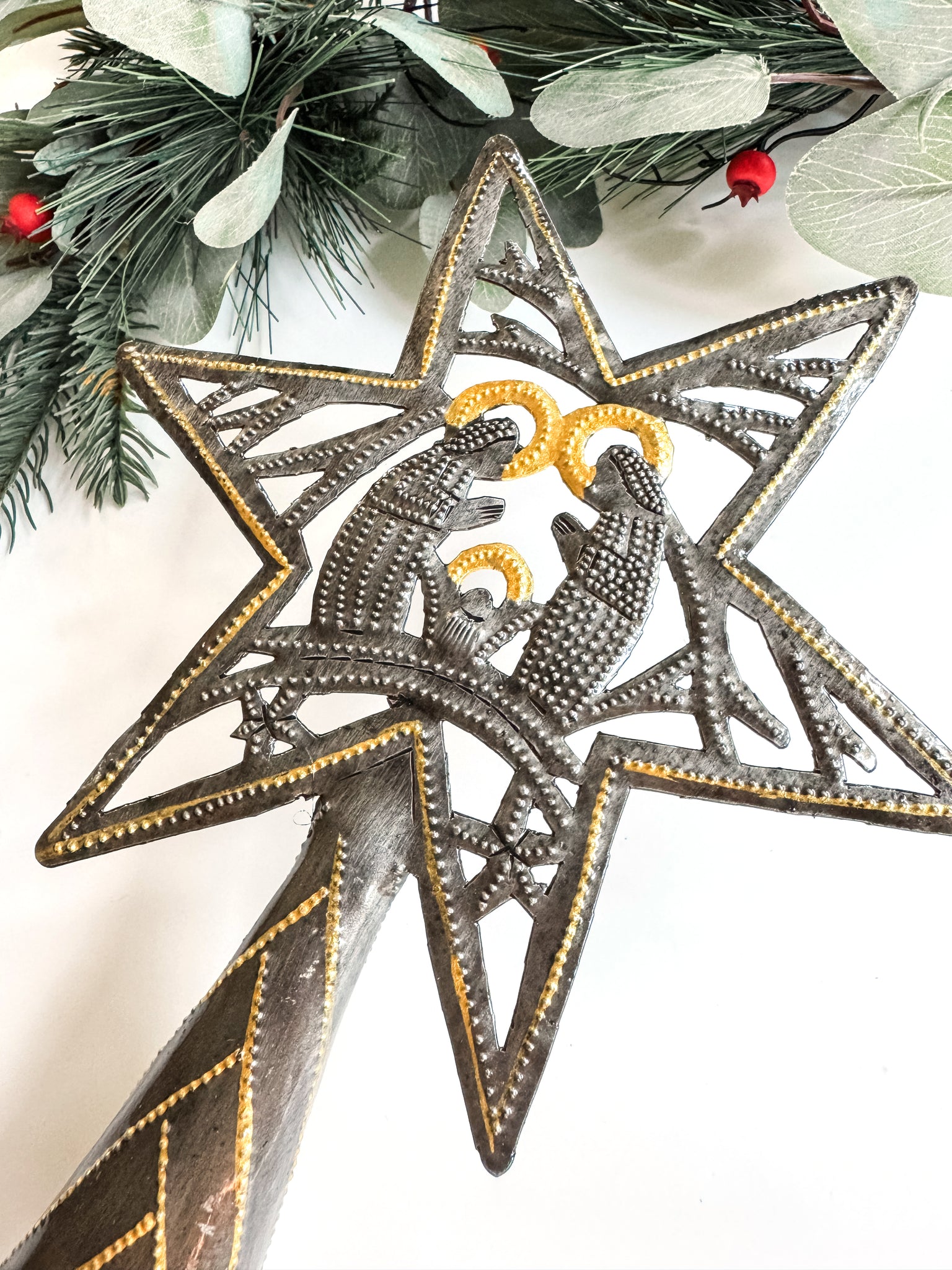 Crown your Christmas tree with meaning and beauty with this handcrafted nativity star tree topper. Made in Haiti from recycled 55-gallon oil drums, each piece is cut, shaped, and detailed by skilled artisans, then finished with intricate designs that highlight the Holy Family at the center. This star adds a heartfelt touch to your holiday décor while supporting sustainable livelihoods.