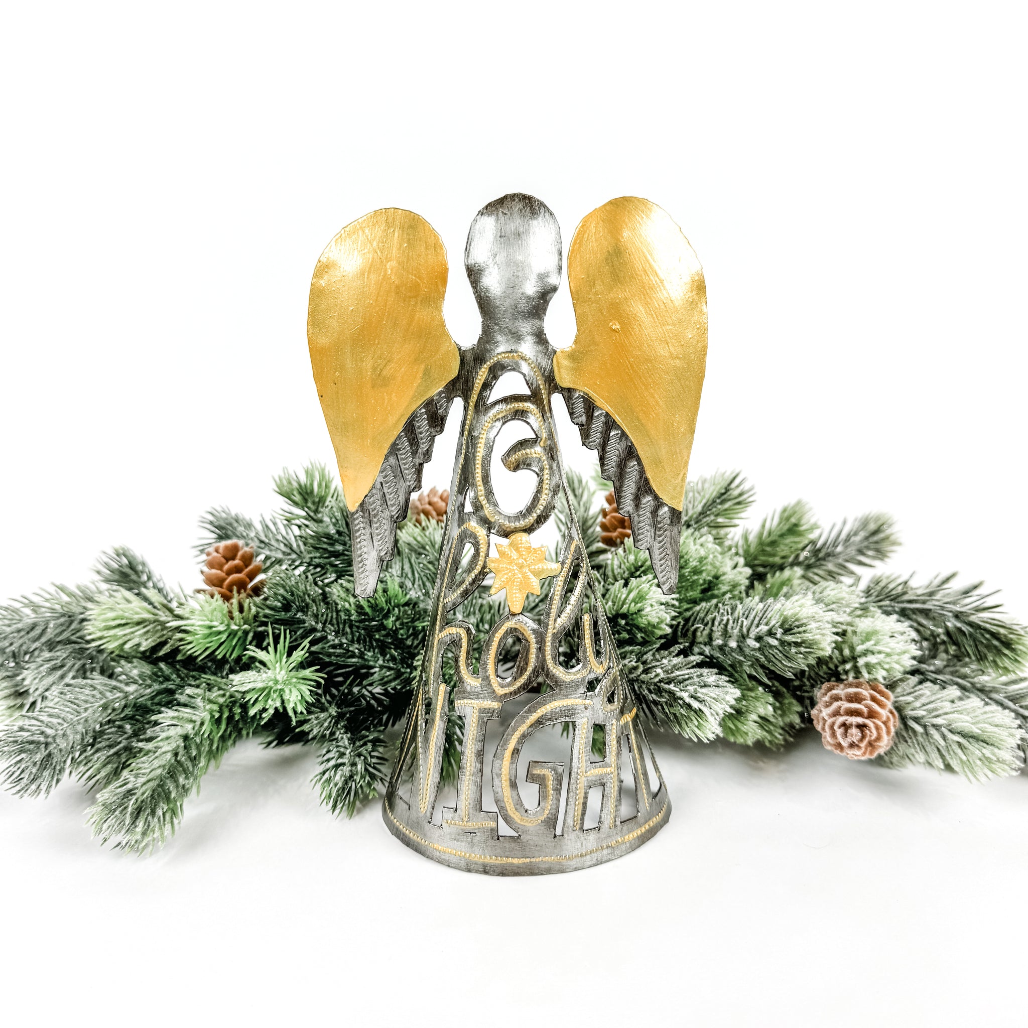 This handcrafted metal angel features the words "o holy night" intricately hand cut into it. This delicate wonder looks stunning as-is. Put a tea light candle behind each angel – and wow!