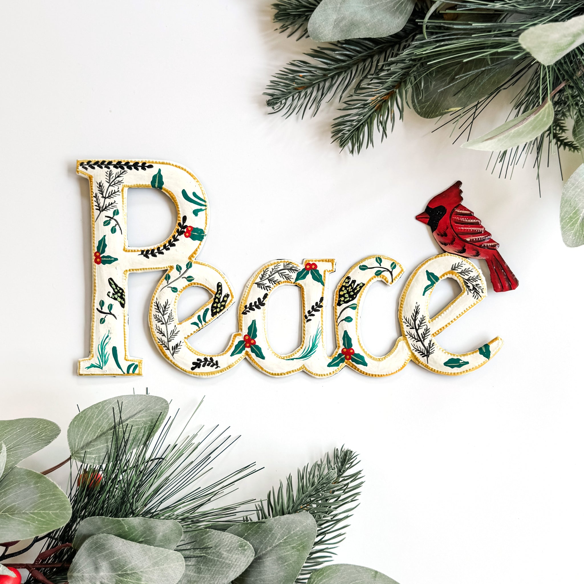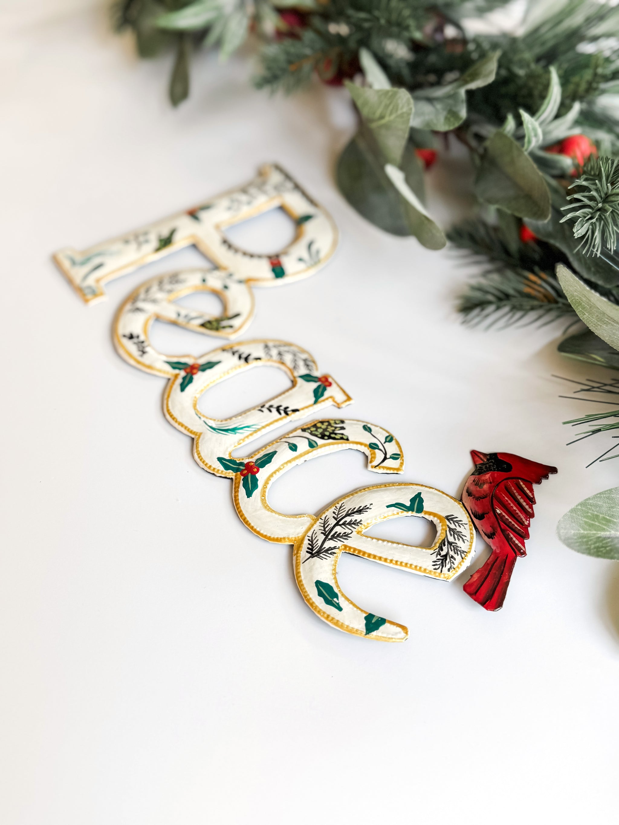 Bring warmth and meaning to your holiday décor with this handcrafted metal wall art. The word “Peace” is beautifully hand-cut and shaped from recycled 55-gallon oil drums in Haiti, then adorned with hand-painted Christmas greenery and a bright red cardinal—a timeless symbol of hope and joy. Perfect for hanging in your home or gifting to a loved one, this piece blends stunning craftsmanship with festive charm, creating a holiday accent that speaks to the heart.