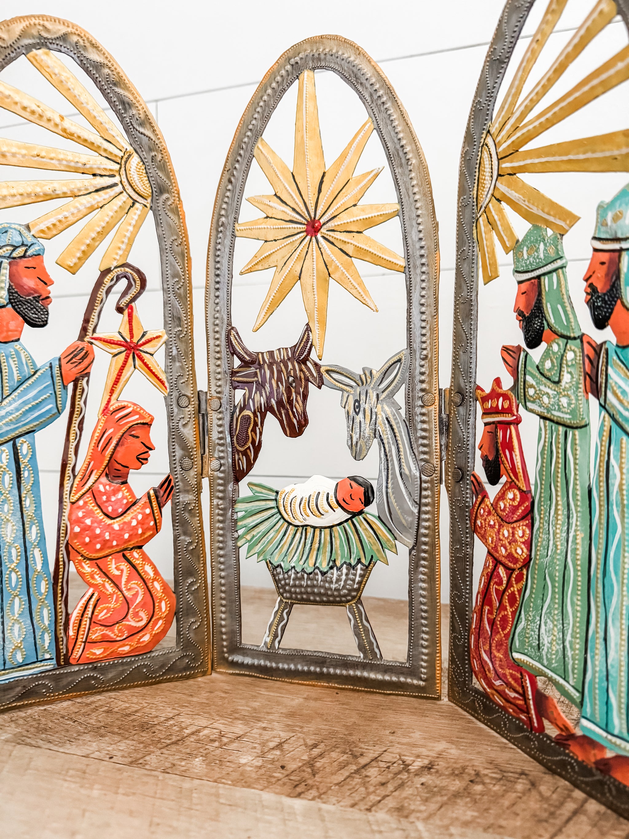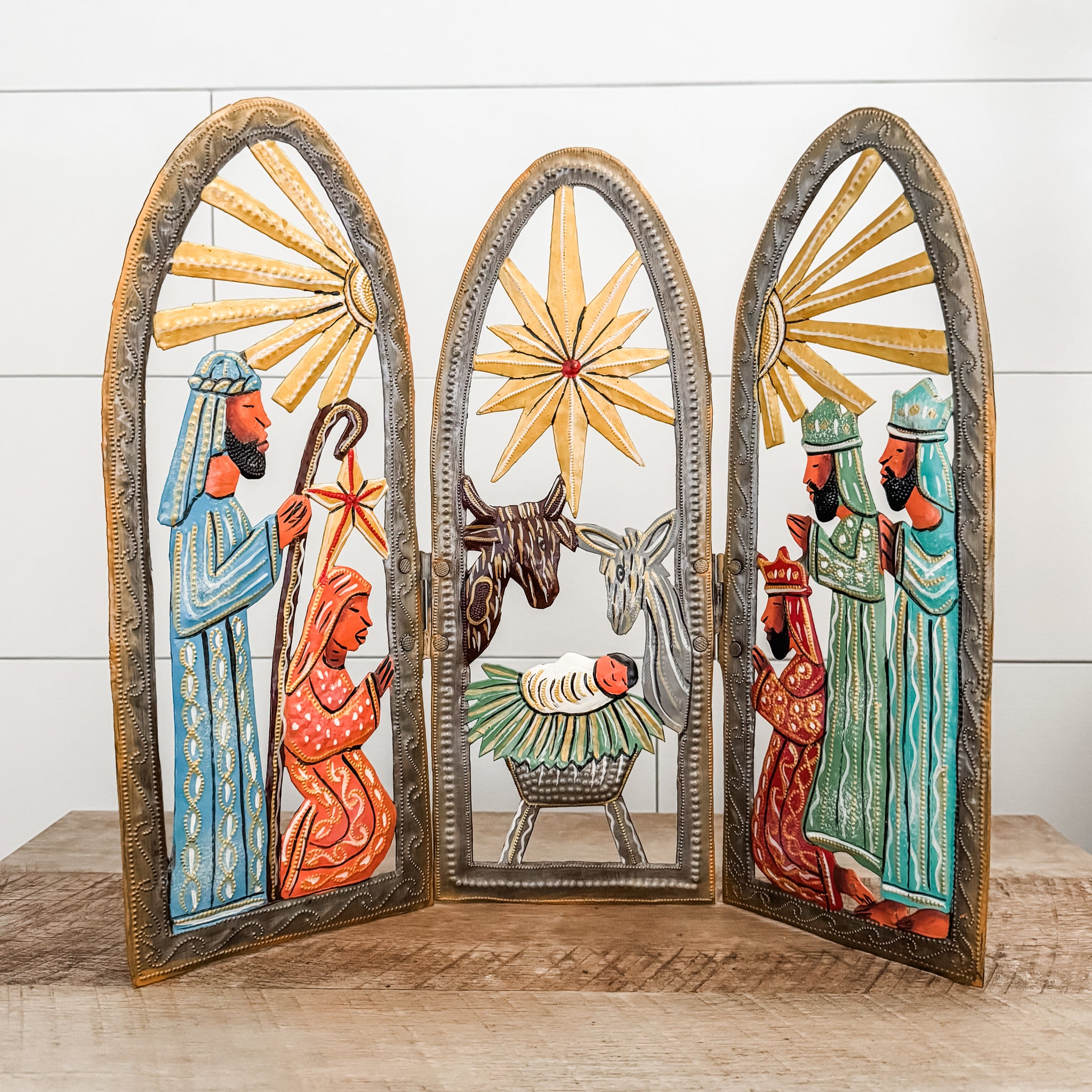 Bring the story of Christmas into your home with this beautifully handcrafted trifold nativity. Each panel is carefully carved and painted by skilled artisans, creating a scene that unfolds like a cherished storybook. Compact yet full of detail, the trifold design makes it easy to display on a mantle, tabletop, or shelf. A meaningful keepsake for your own home or a heartfelt gift to share the spirit of the season.