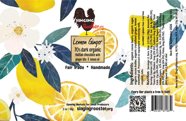 Lemon Ginger: 70% Dark - Organic Haitian Cocoa Beans, Organic Cane Sugar, Organic Cocoa Butter, Organic Crystalized Ginger, Lemon Essential Oil