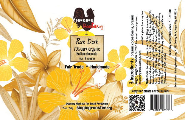 The purchase of this creamy, dark chocolate bar not only provides meals for children around the world, it also supports our artisan partner, Singing Rooster, whose mission empowers rural families in Haiti by paying higher than fair trade wages to farmers and promoting social & environmental responsibility along with reforestation efforts in farming communities throughout Haiti.
